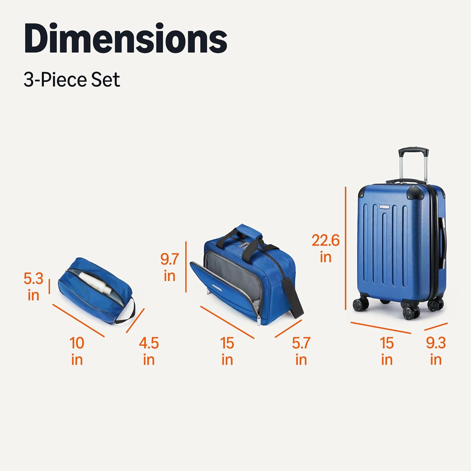- VERSATILE CARRY-ON SET: Includes travel case, tote, and hardside suitcase; travel case measures 10 x 4.5 x 5.3 inches, tote measures 15 x 5.7 x 9.7 inches, suitcase measures 15 x 9.3 x 22.6 inches (all measurements include wheels)