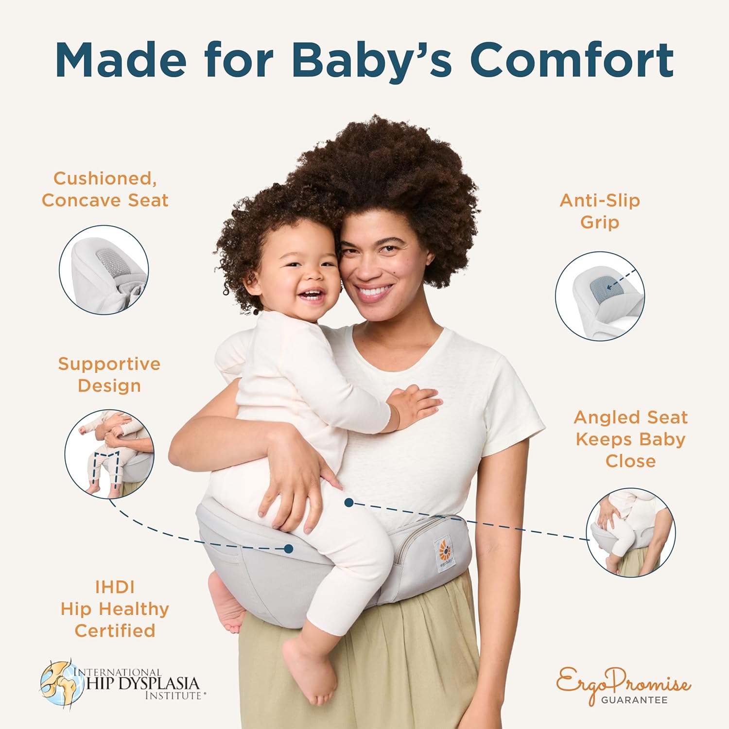 - SUPPORTIVE ERGONOMIC SEAT: The cushioned seat of hip baby carrier is gently curved to support baby’s hips and thighs. The anti-slip panel helps keep baby in position while the angle of the seat promotes closeness and comfort.