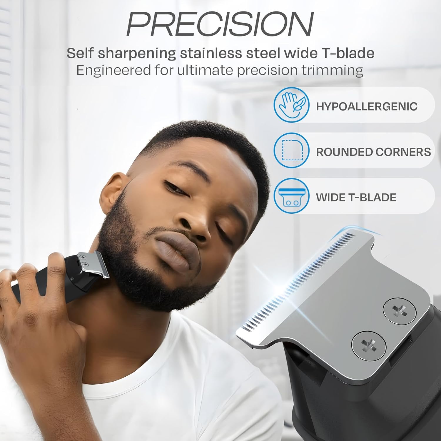 - ULTIMATE PRECISION – Engineered with hypoallergenic, self-sharpening, durable stainless-steel blades that deliver precise, clean cuts. The wide T-blade makes it ideal for detailed styling and finishing touches. From head and face to body hair, Forget about the frustration of nicks, bumps and cuts.