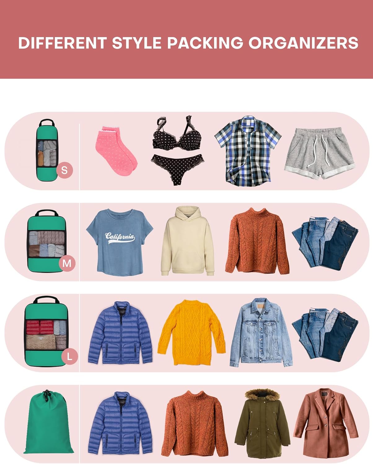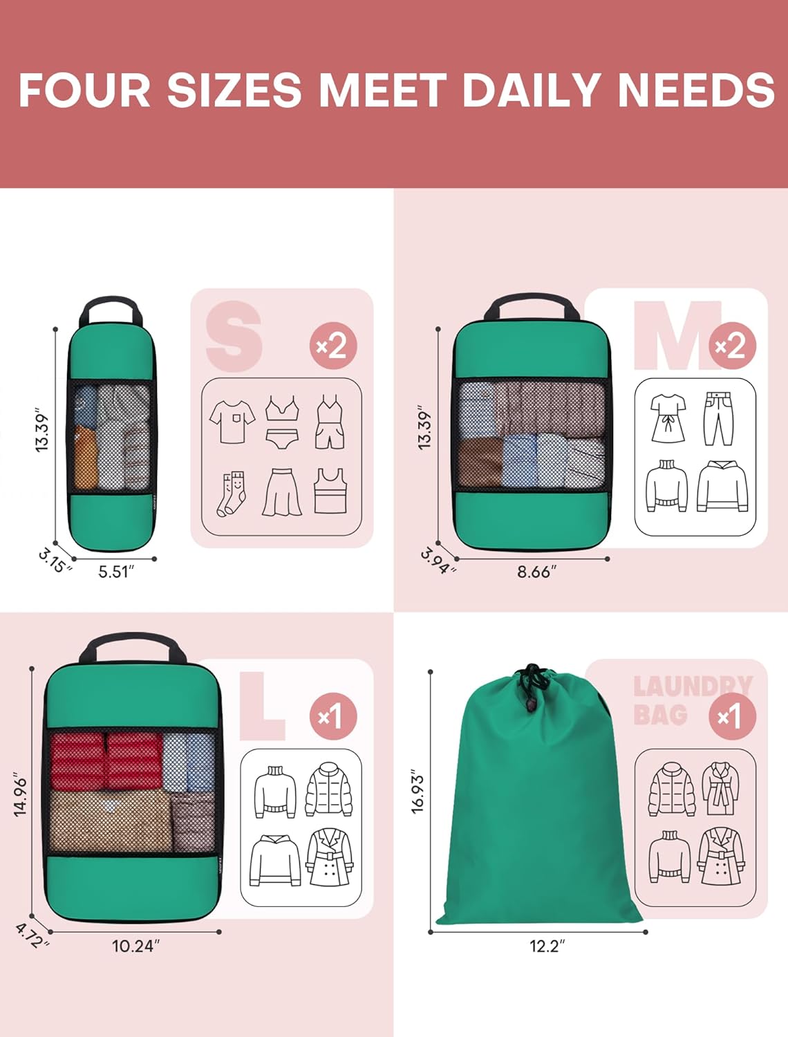 - VERSATILE & FLEXIBLE: Includes 6 pcs organizers for different items: 2 small cubes, 2 Medium cubes, 1 Large cube and 1 drawstring pocket. Moreover, these packing cubes can be used to stay organized at home, while traveling, and are perfect for camping or any outdoor adventure! You can easily fit them into your suitcases, totes, backpacks, duffel bag, etc.