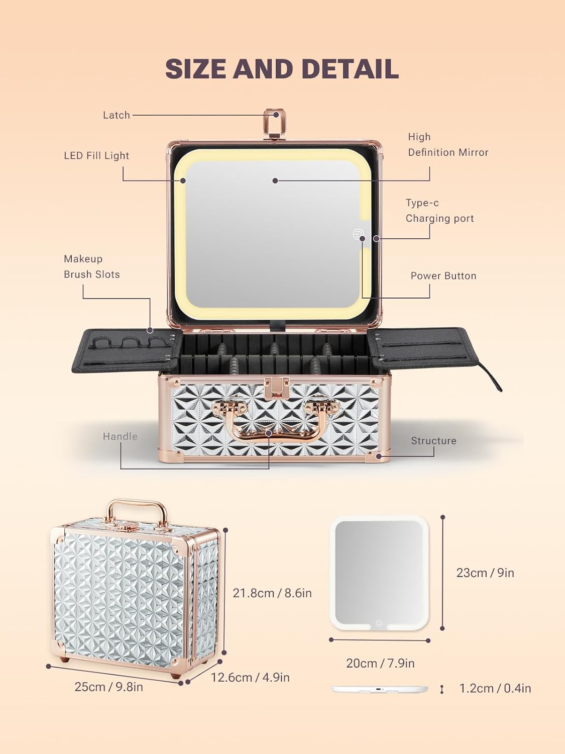Qislee Makeup Box with A Detachable Lighted Mirror, Waterproof Travel Train Case, Cosmetic Organizer and Makeup Suitcase with Adjustable Dividers, Magnetic LED Mirror(Sparkling Silver)