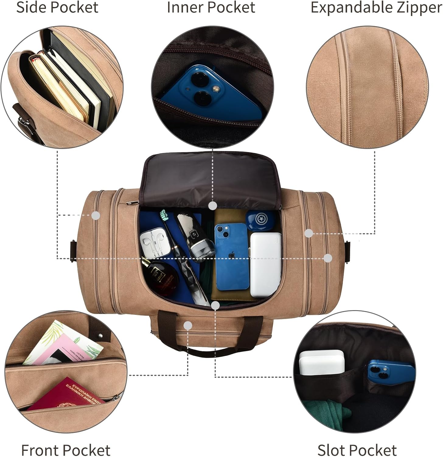 - Durable & Heavy-Duty – Built to Last.Crafted from premium 16oz canvas, this large duffle bag for men offers exceptional durability and reliability. Reinforced with sturdy metal hardware, it can withstand weights of up to 35kg, making it the perfect choice for rugged travel. Whether for daily use or weekend trips, this overnight bags for men is designed to handle it all.
