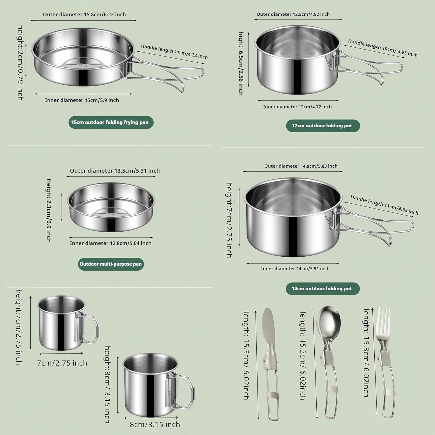 - Versatile Cookware Set: The set includes a 2 small pots/bowls, a small frying pan,2 cups, 2 forks,2 spoons,2 knives, and 1 small dish and storage bag for convenient organization.