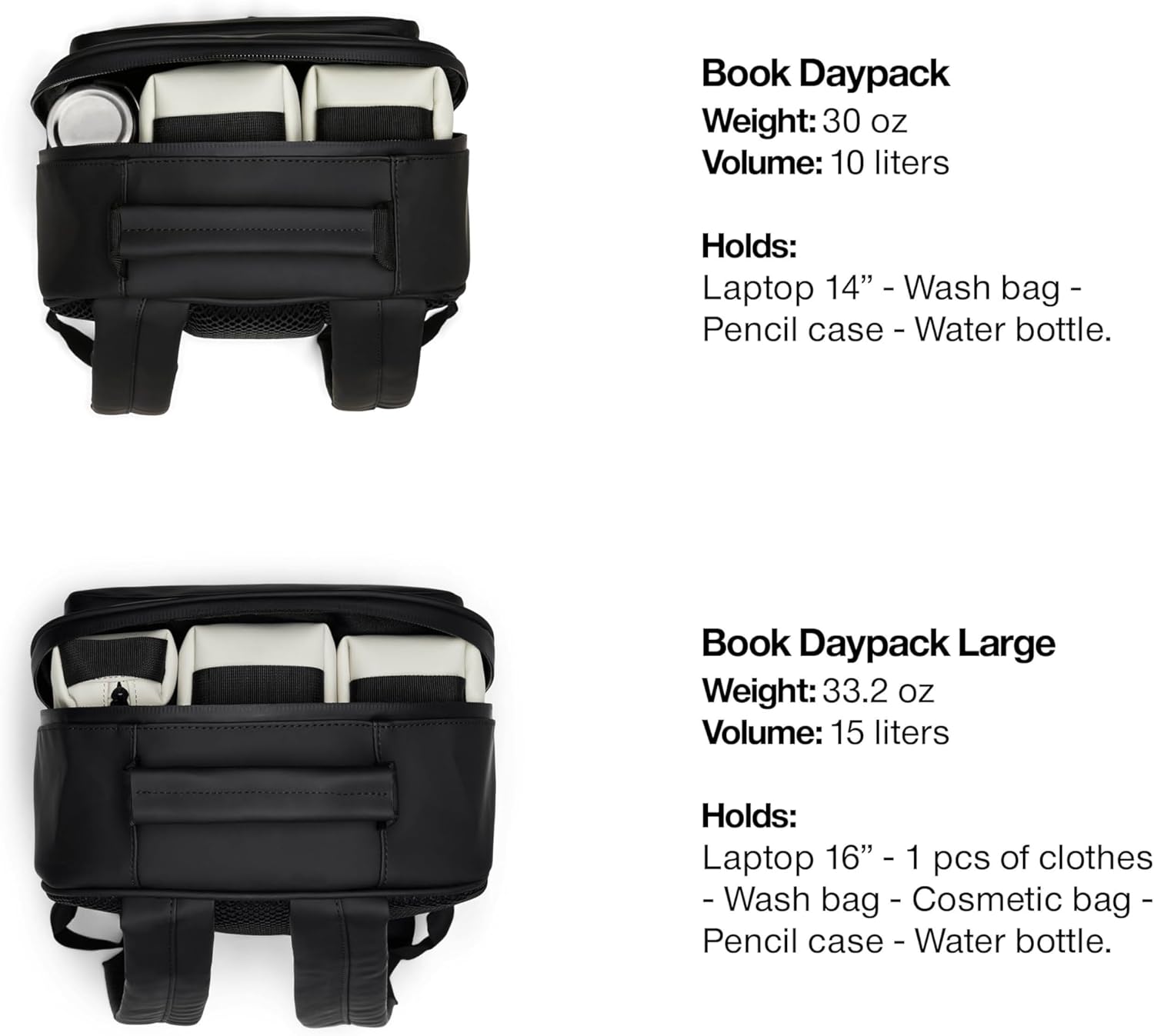 - WATERPROOF: Book Daypack Large is a waterproof bag offering a minimal silhouette in campus-ready proportions. The design is characterized by its curved top, sharp base, and large front zip pocket. Opening the main coated zip reveals a spacious main compartment, which includes, a padded laptop sleeve for devices up to 16”.