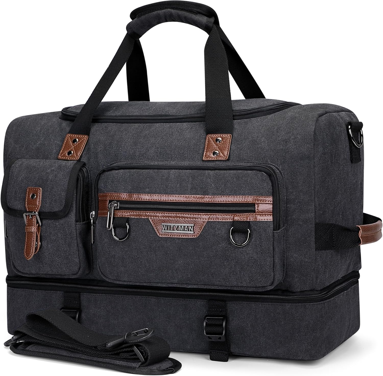 WITZMAN Canvas Weekender Bag Mens Overnight Bag for Traveling Carry on Duffle Bags with Shoes Compartment(A8010 Black)