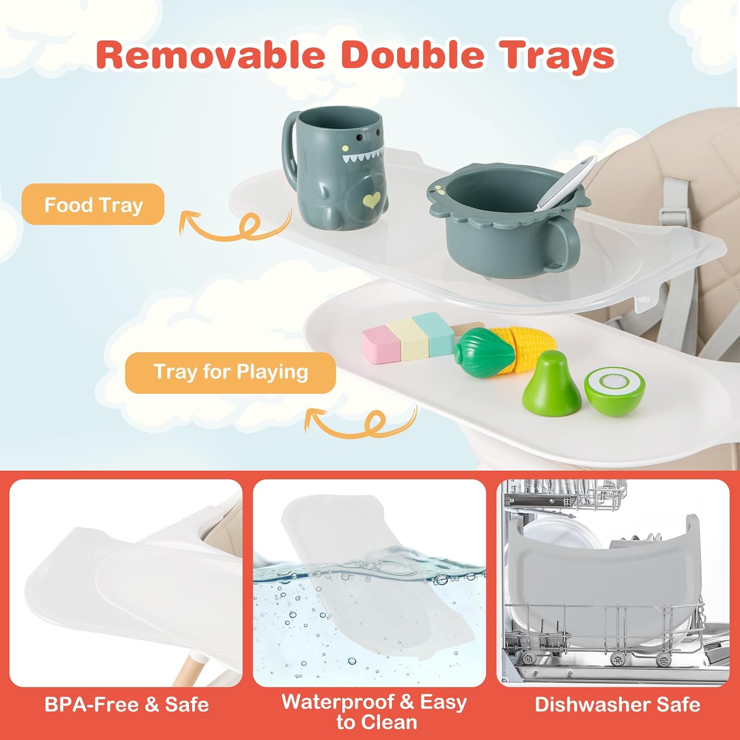 - 【Removable Double Trays】This convertible baby high chair comes with an upper food tray and a lower tray for playing. The trays are made of BPA-free & safe PP material. In addition, they are removable, dishwasher safe, waterproof and easy to clean.