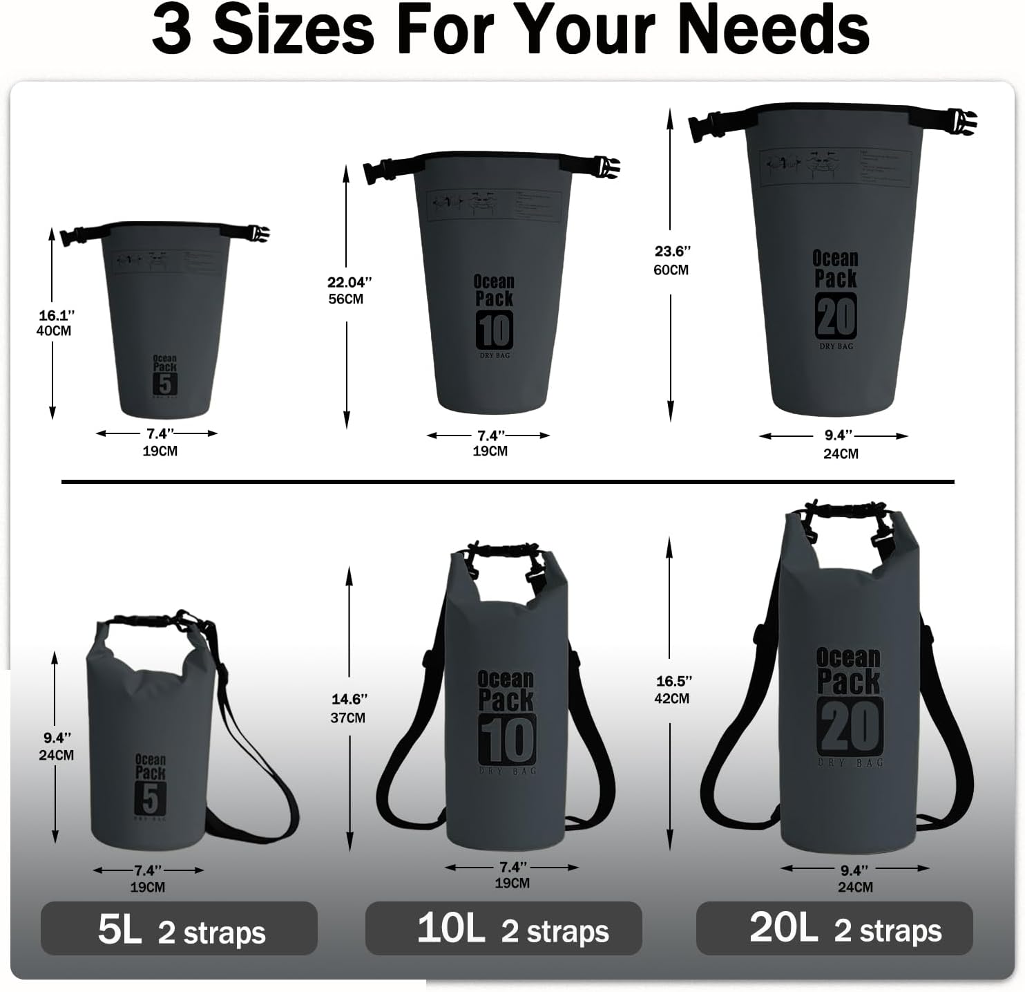 - All-Adventure Carry Solution - This waterproof dry bags feature adjustable shoulder straps for comfortable carrying and effortless removal, accommodating all body types. The 5L,10L 20Land 30L options boast dual straps for backpack-style carrying. Easily foldable for compact storage, these dry bags offer versatile carrying options to suit your every need.