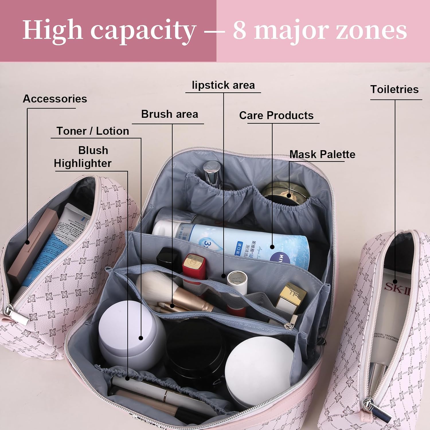 - 3 Piece Makeup Bags Set: This travel make up bags for women comes with two detachable zipper storage bags and 5 compartments, ensuring optimal organization for your skin care products and cosmetics. Perfect for your travel, business trips, vacations, outdoor activities and picnics