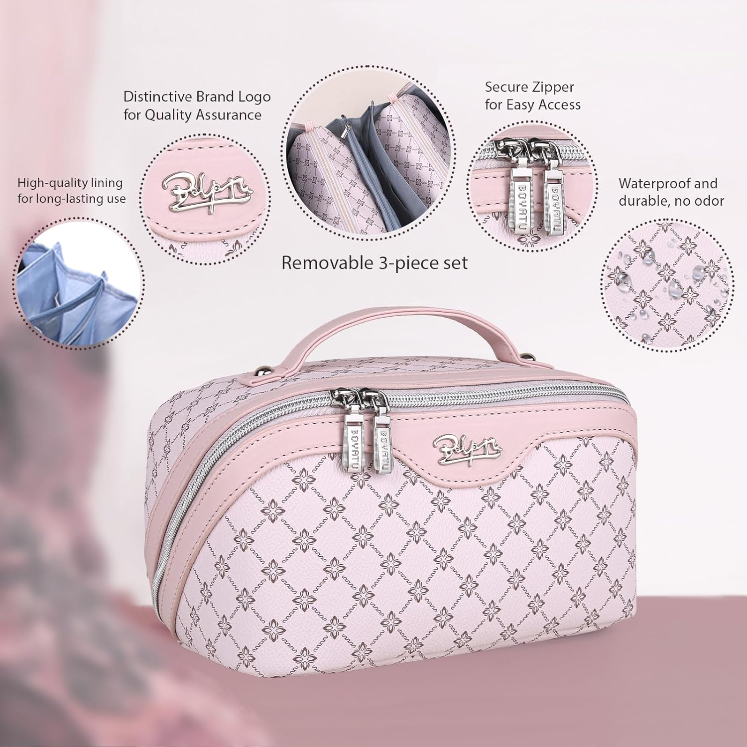 BOYATU Travel Makeup Bag Cosmetic Bags for Women: 3 Pcs Set Portable Make up Bag with Handle - Vegan Leather Toiletry Bags with Compartments - Makeup Organizer for Travel Essentials(01-Pink)