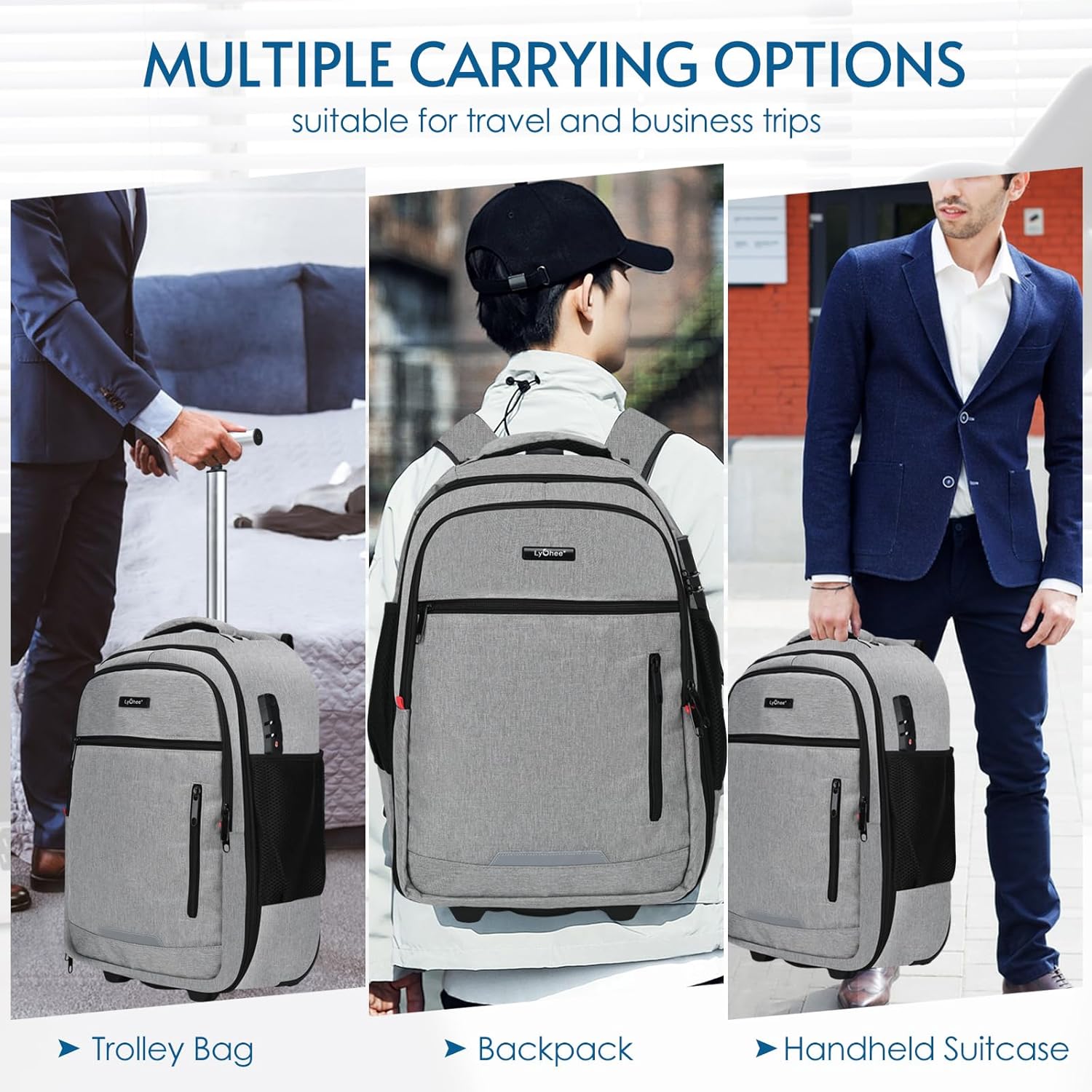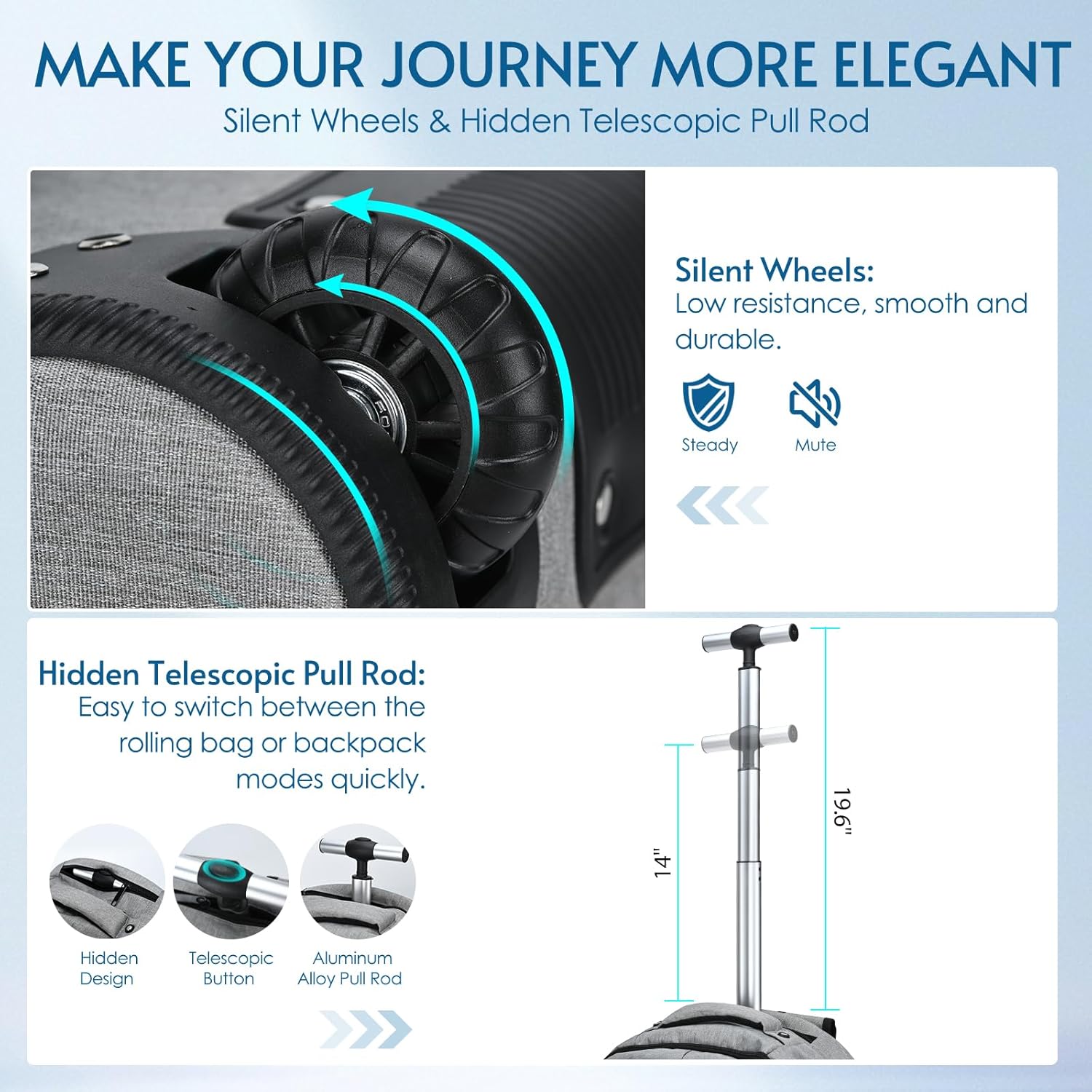 lychee Concealable Rolling Backpack-Adult Business Laptop Backpack with Wheels-20 inch Invisible Shoulder Strap Waterproof Backpack with Roller-Suitcase Travel Bag,Grey