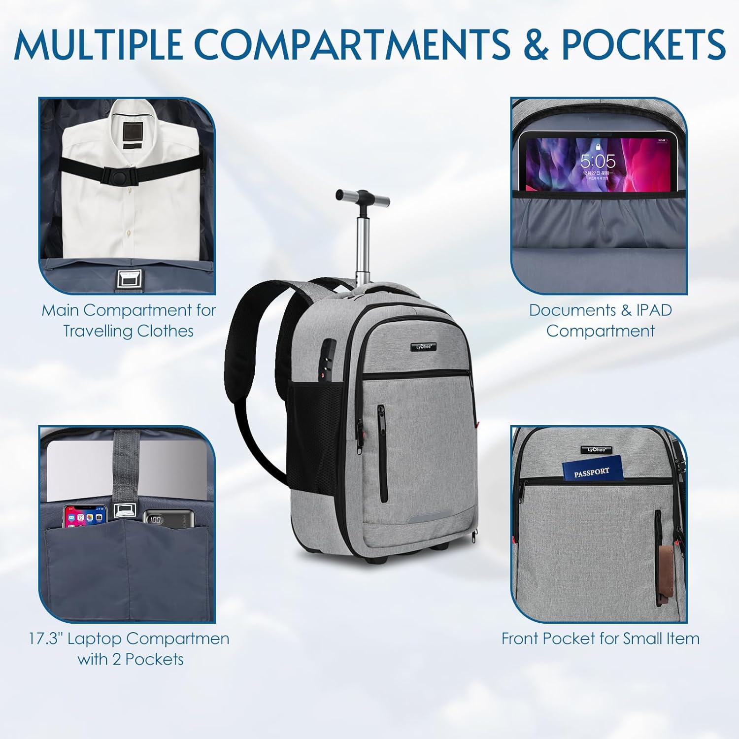 - 【Multi-compartment】The rolling laptop backpack has plenty of space for your daily needs, with two main compartments. It also has a padded pocket for a laptop up to 17 inches, as well as two pockets for water bottles on the sides. The capacity of the backpack is about 40L.
