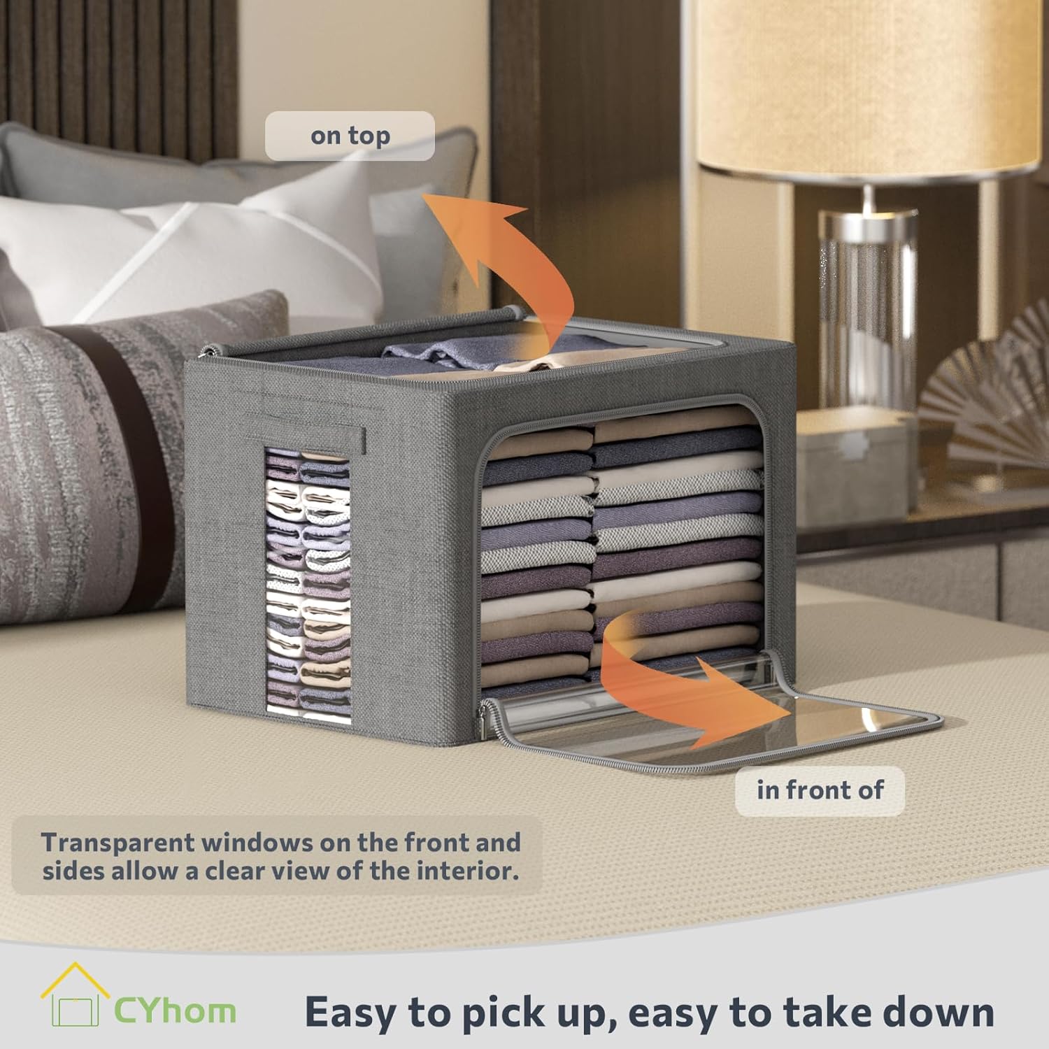 4 Pack Clothes Storage Bins with Metal Frame - Linen Fabric Foldable Stackable Container Organizer Set with Clear Window & Carry Handles & Zippers (Dark Gray, 23.6"x16.5"x15.7")