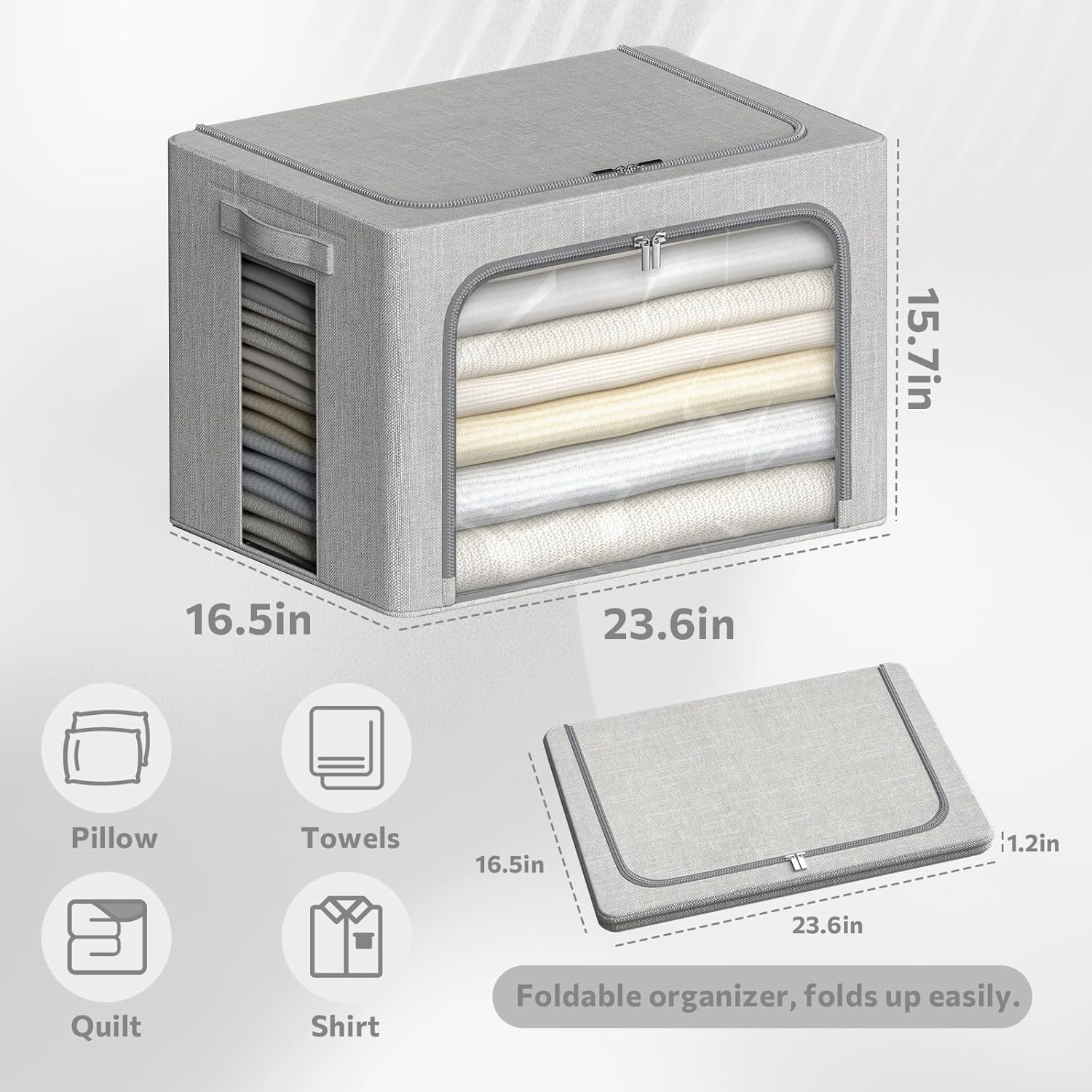 4 Pack Clothes Storage Bins with Metal Frame - Linen Fabric Foldable Stackable Container Organizer Set with Clear Window & Carry Handles & Zippers (Light Grey, 23.6"x16.5"x15.7")