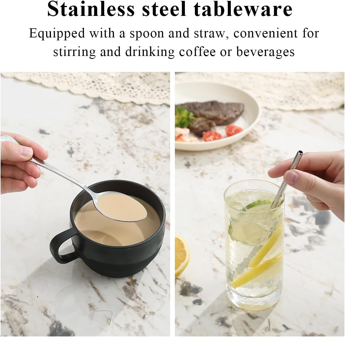 - Portable Travel Cutlery Set Includes: 1 black plates, 1 black coffee mug, 1 straight straw, and 1 set of stainless steel cutlery, the cutlery includes knive, fork, spoon and chopsticks. You will receive a beautifully complete set!