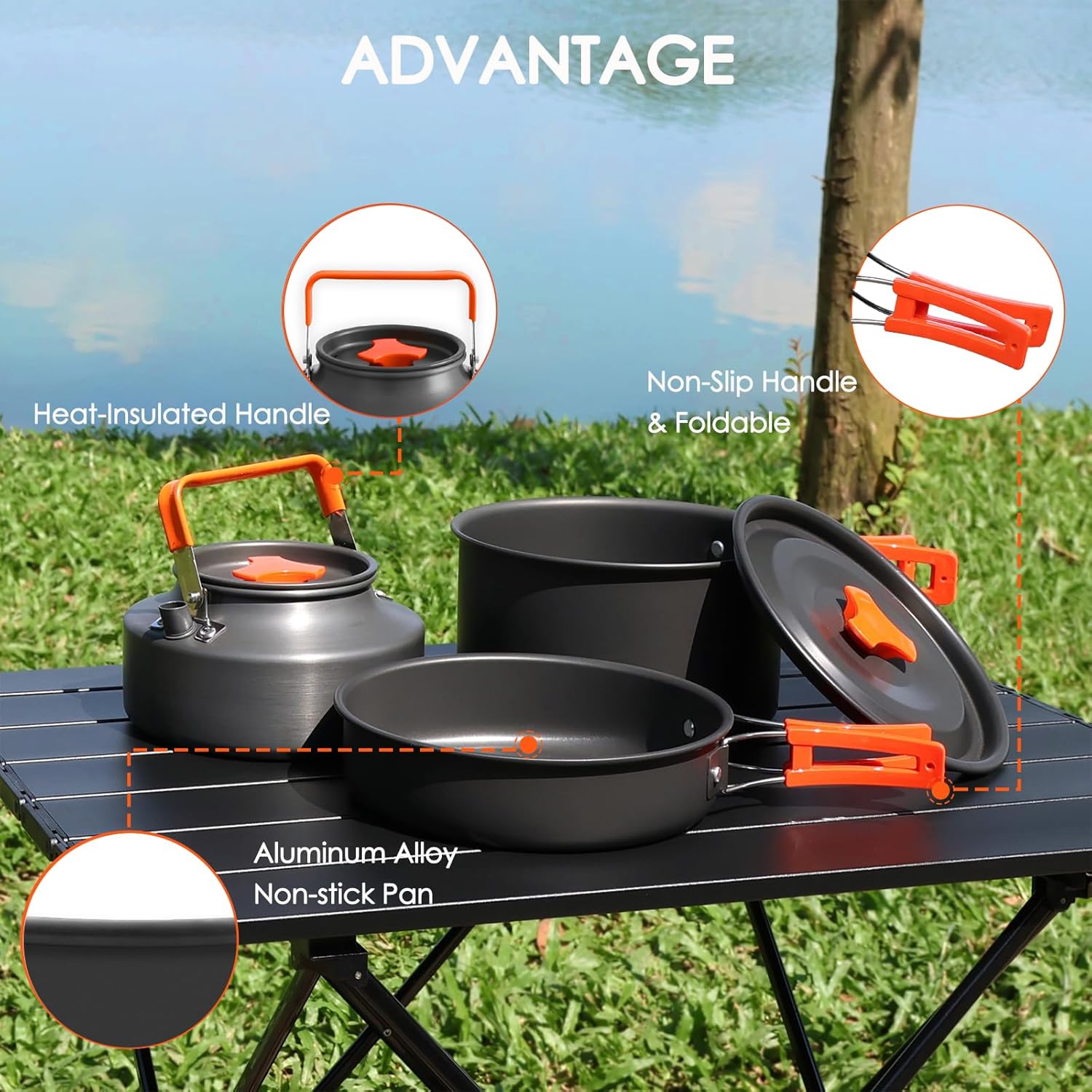 - Food-Grade Cookware Mess Kit: The camping pot and pan are made from non-toxic, lightweight anodized aluminum that heats up quickly. Camping cookware have a brushed surface with a non-stick coating for better wear and corrosion resistance, easy cleaning, and less oil use. The foldable silicone handles are heat-resistant and non-slip. This durable camping cooking set is easy to carry and perfect for camping.