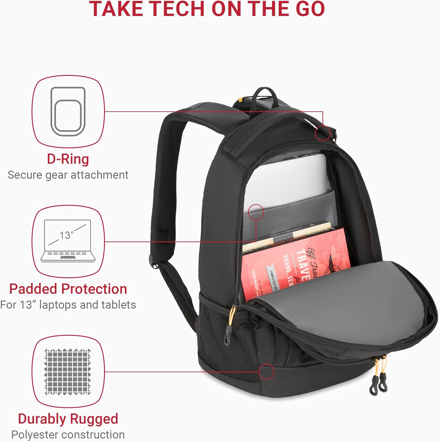 - 13-Inch Laptop Backpack: Tackle your daily commute with this reliable backpack featuring padded 13” laptop and tablet pockets, an organizer compartment for pens and accessories, and a front bungee cord system