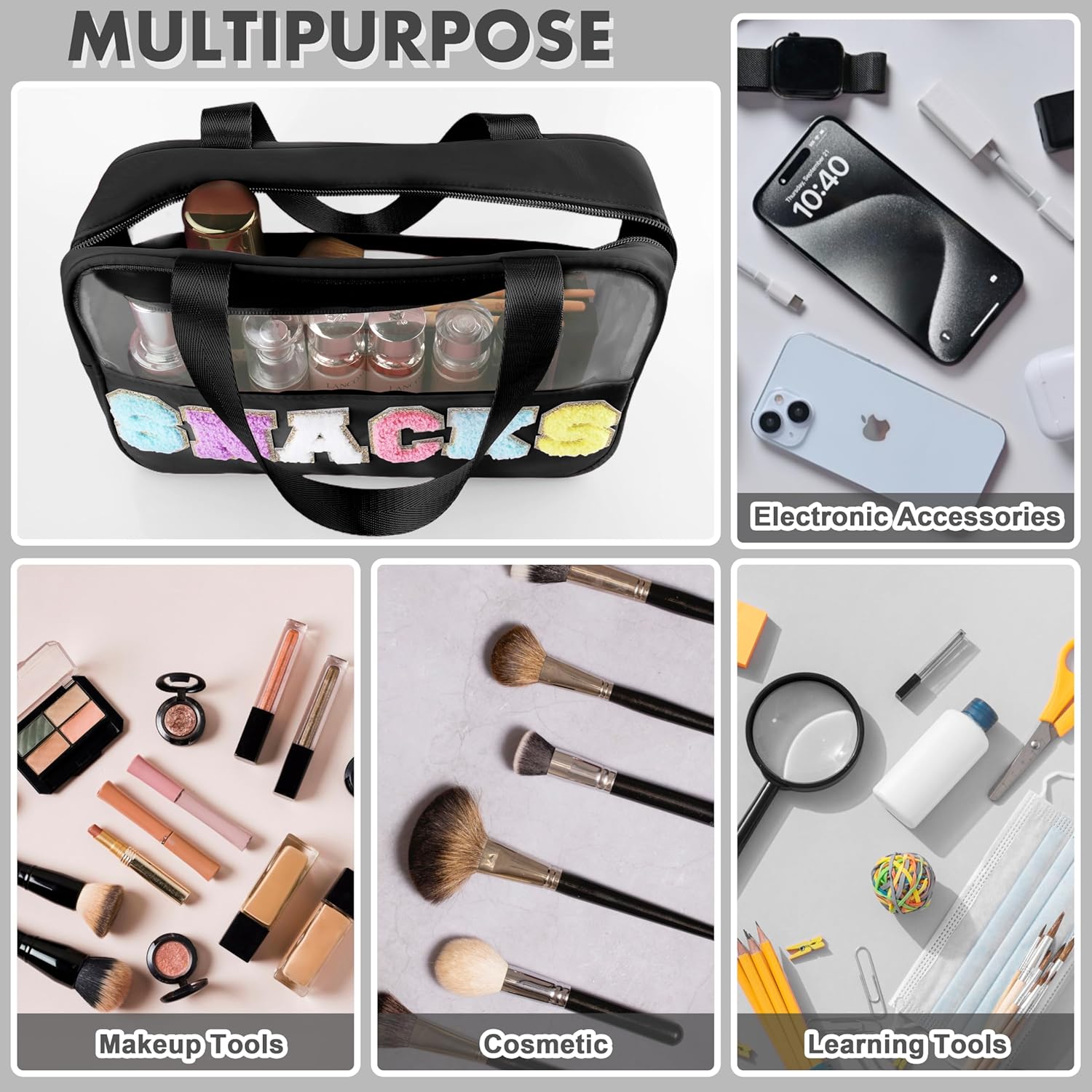 - Unique Fashion Design: Preppy makeup bag with golden glittering chenille patch, Stylish and Skin-friendly, it makes you feel comfortable. The cute letters pattern patch make your snacks bag stand out from all the clear zipper pouches. These letters are sewn onto the bag, very sturdy, and you don't have to worry about them falling off
