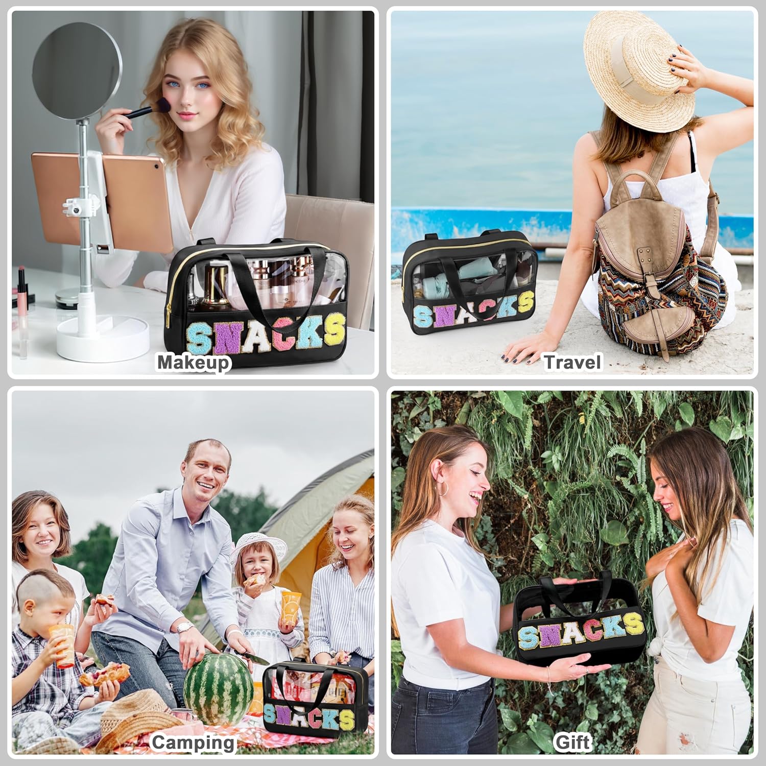 Snack Bag for Travel - Chenille Letter Clear Makeup Bag, Large Preppy Patch Snack Cosmetic Bag with Handle and Zipper, Cute Makeup Pouch Nylon&PVC Waterproof Toiletry Organizer Storage for Women