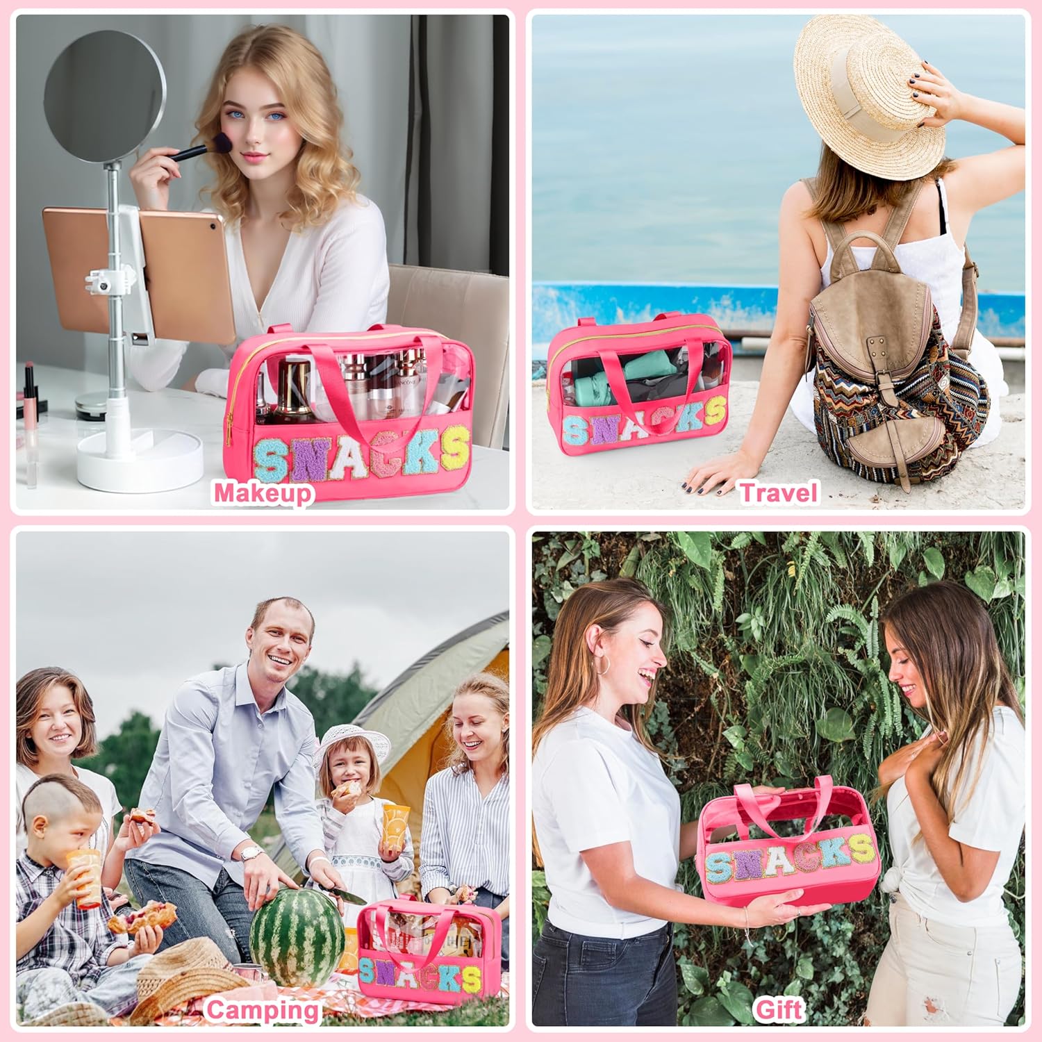Snack Bag for Travel - Chenille Letter Clear Makeup Bag, Large Preppy Patch Snack Cosmetic Bag with Handle and Zipper, Cute Makeup Pouch Nylon&PVC Waterproof Toiletry Organizer Storage for Women Girls