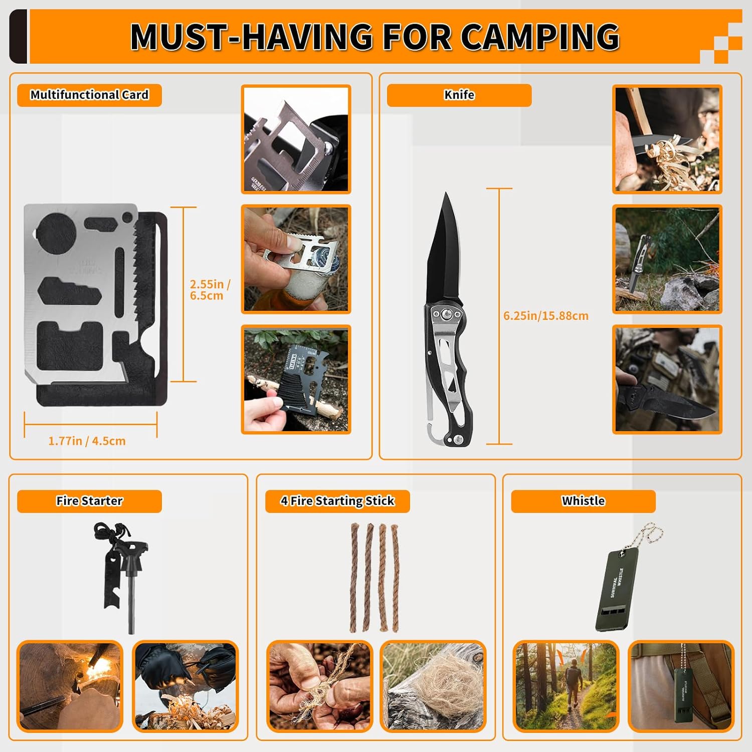 - 【Reliable & High Quality Survival Kits】This is a multi hiking first aid kit, including various survival tools. It could assist you in creating a makeshift shelter, provide additional security and warmth, retain body heat. And all the survival gear have been tested to ensure they can withstand tough environment and conditions, such as outdoor adventure, natural disasters such as earthquake, tornado. Great gift idea for men women who love camping, hiking, car travel, wilderness adventure.