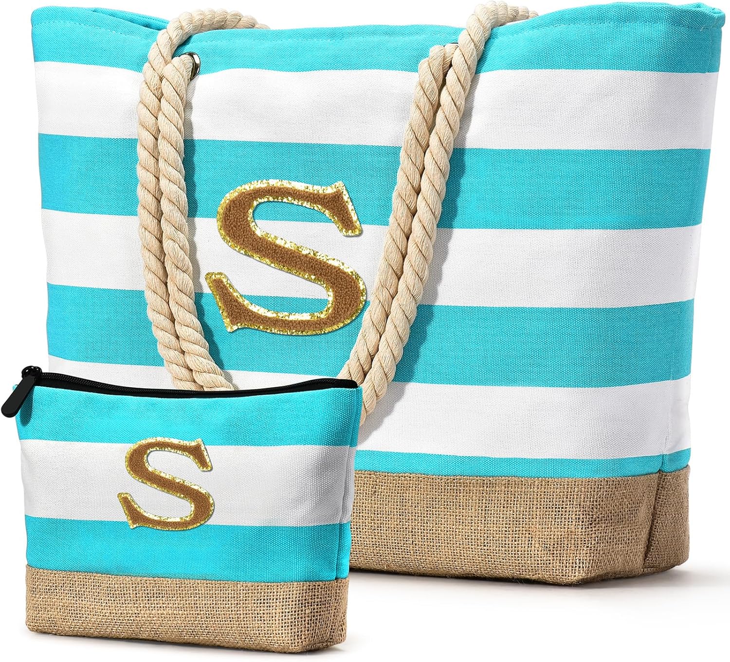 Becokan Beach Bag Initial Beach Tote with Makeup Bag for Travel Work Storage Personalized Birthday Gifts for Women Her