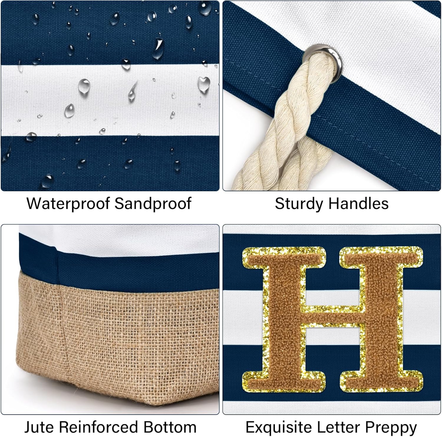 • Stylish & Unique Design: Adorned with a chic, stitched chenille letter edged in gold, the canvas tote bag is both stylish and unique. The letter symbolizes your individuality, while the classic stripe pattern and reinforced jute bottom add a touch of sophistication, making it suitable for any occasion