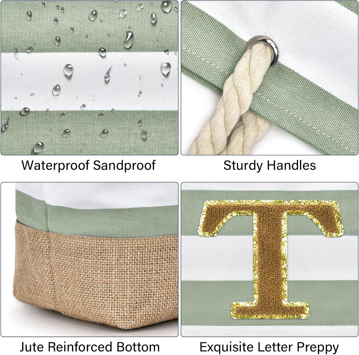 - Stylish & Unique Design: Adorned with a chic, stitched chenille letter edged in gold, the canvas tote bag is both stylish and unique. The letter symbolizes your individuality, while the classic stripe pattern and reinforced jute bottom add a touch of sophistication, making it suitable for any occasion