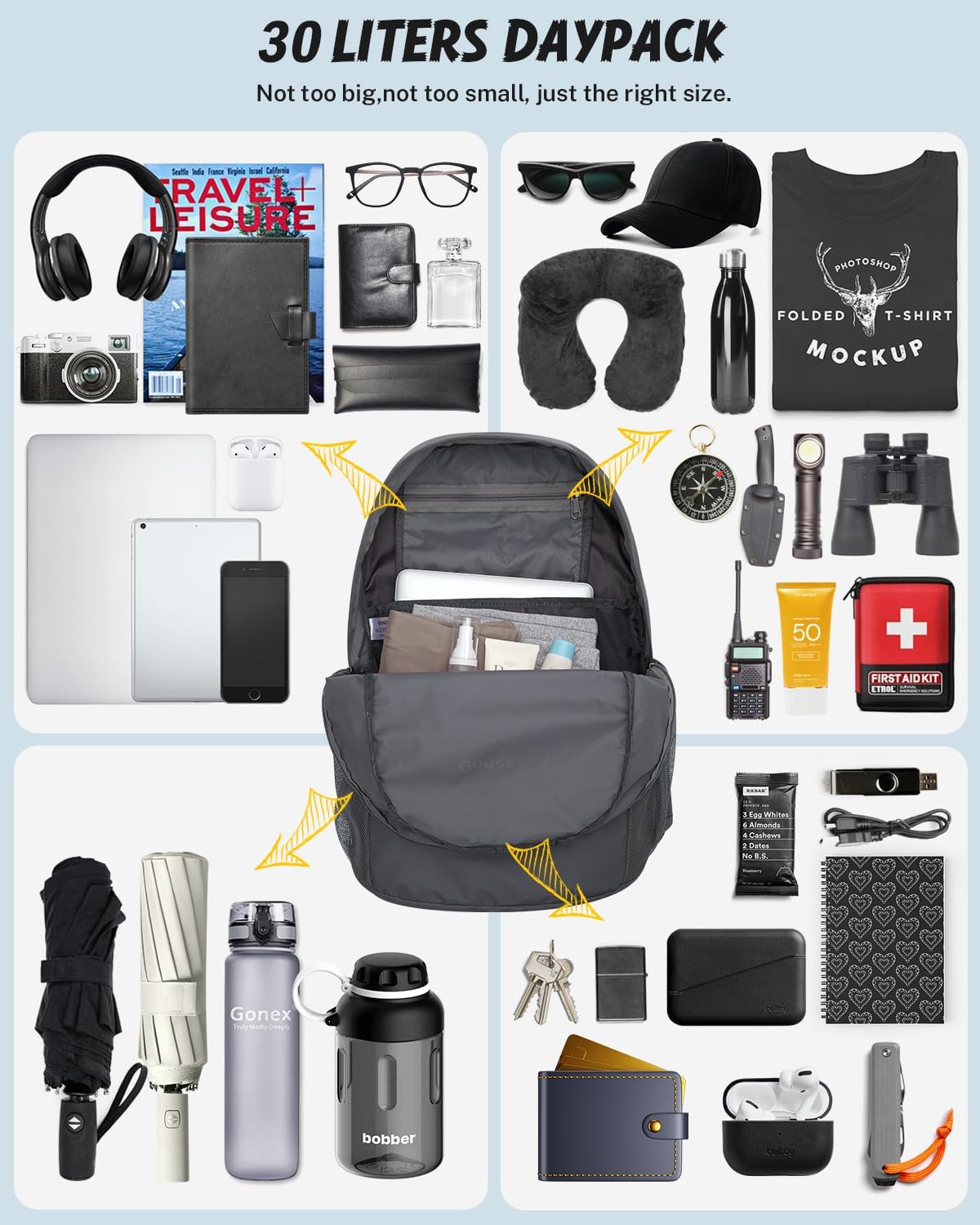 - Keep things organized: 30L hiking daypack with four zippered compartments include a waterproof bag. A spacious main pocket for your essentials, an outer pocket for quick-access items like guidebooks and cameras, and a secure inner pocket for valuables like cash, cards, and passports