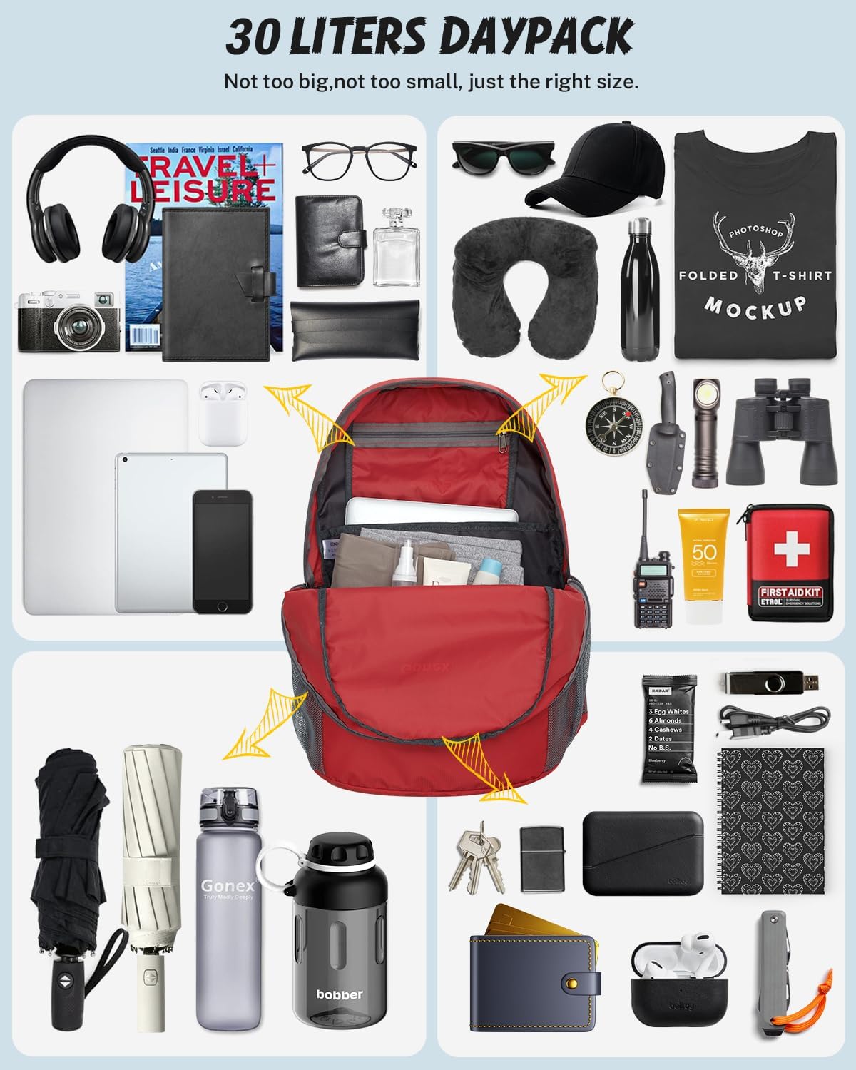 - Keep things organized: 30L hiking daypack with four zippered compartments include a waterproof bag. A spacious main pocket for your essentials, an outer pocket for quick-access items like guidebooks and cameras, and a secure inner pocket for valuables like cash, cards, and passports