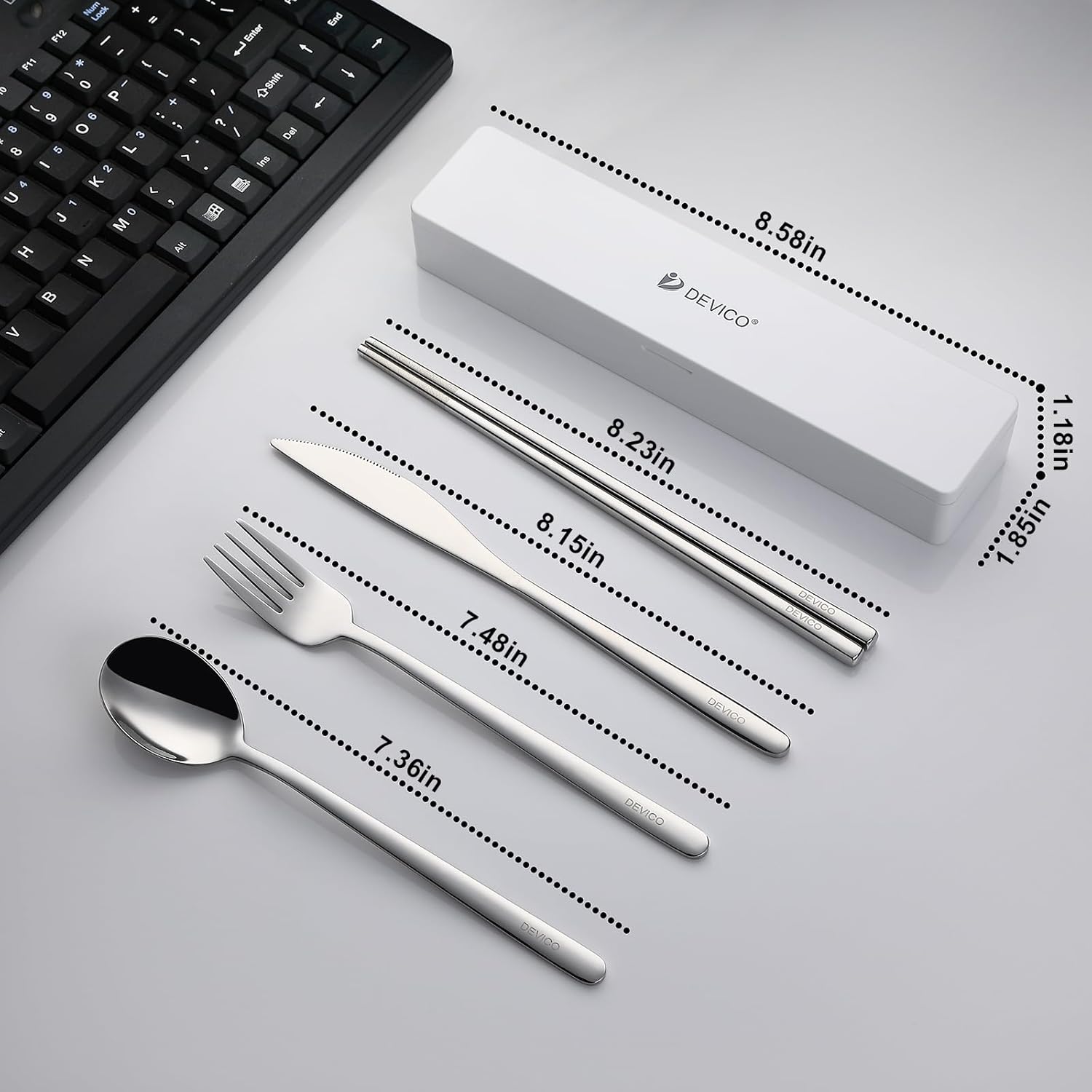 - Portable with Less Noise: DEVICO travel cutlery set is equipped with two detachable silicone slots. Easy to clean. And fix each reusable silverware stably, further noise reduction than plastic slots
