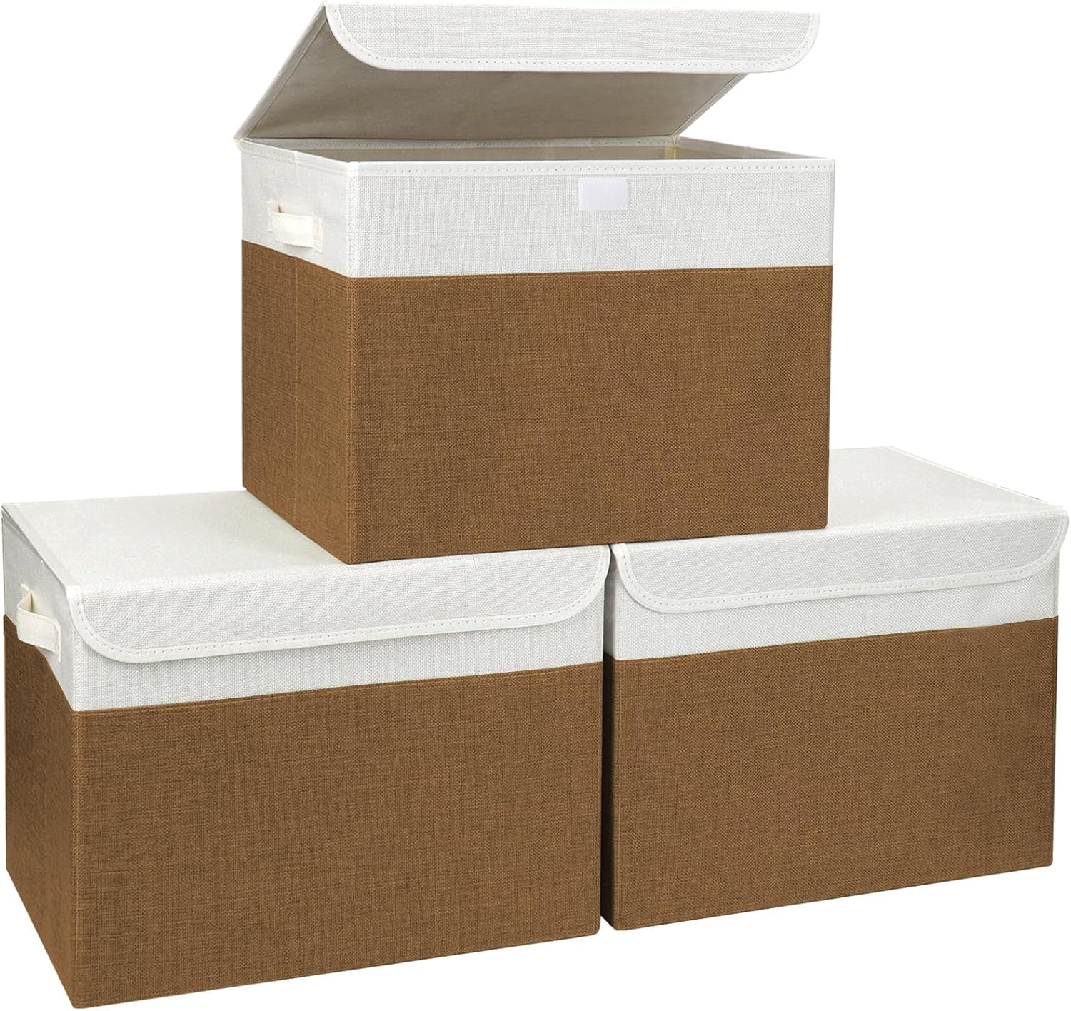 Large 17" 42 Quarts Collapsible Stackable Storage Bins with Lids [3-Pack] Foldable Fabric Linen Storage Boxes Cube, Closet Organizer Baskets with Label for Home (16.7 x 12 x 12", Brown & White)