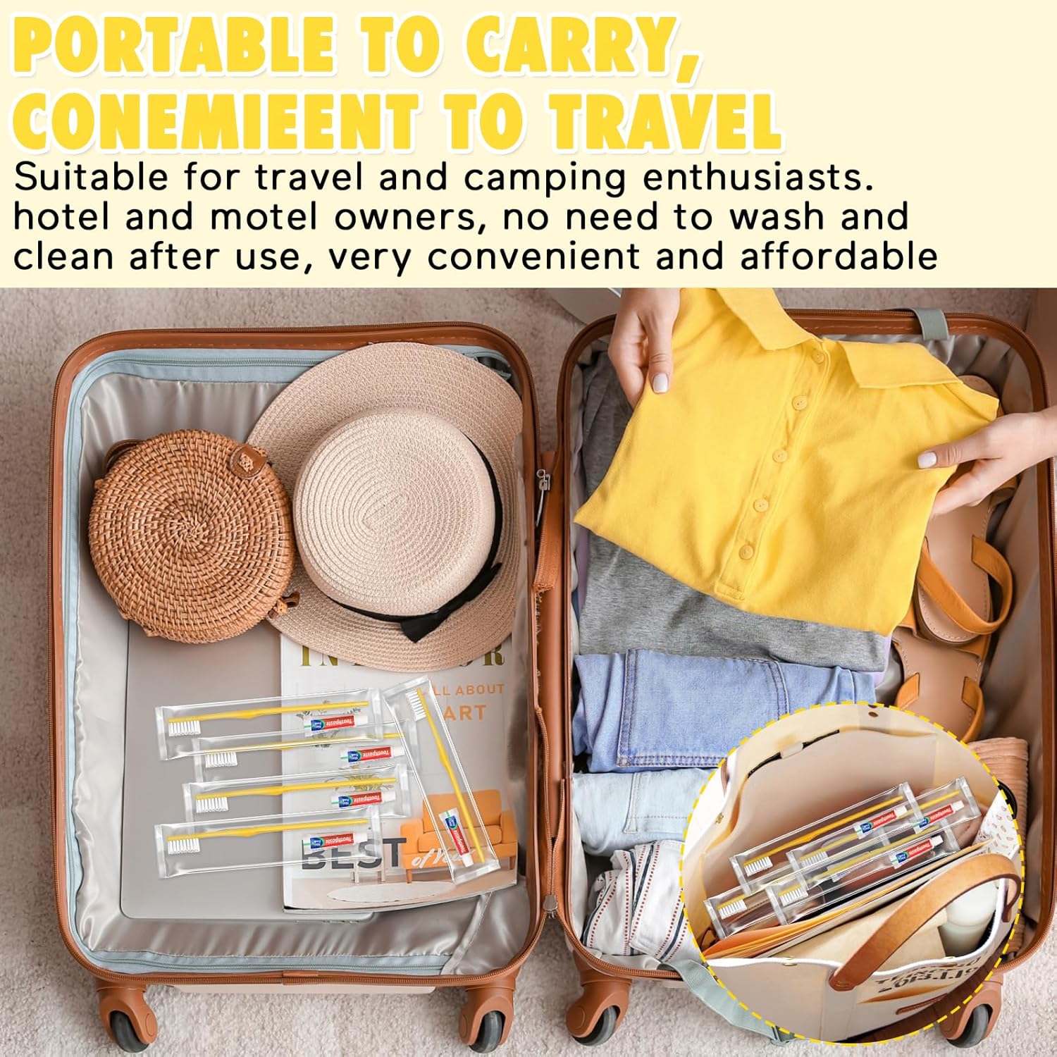 HOFASON Disposable Toothbrushes Pack of 50, Yellow Hollow Travel Toothbrush Set with Individually Wrapped Toothpaste for Homeless, Nursing Home, Shelter, Hotel