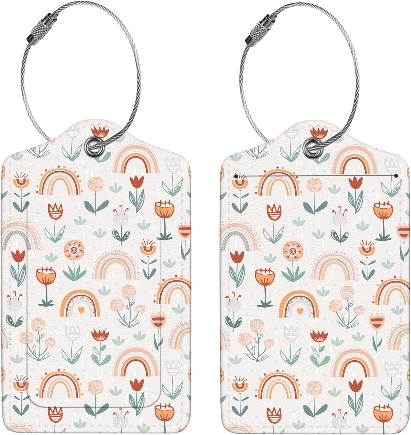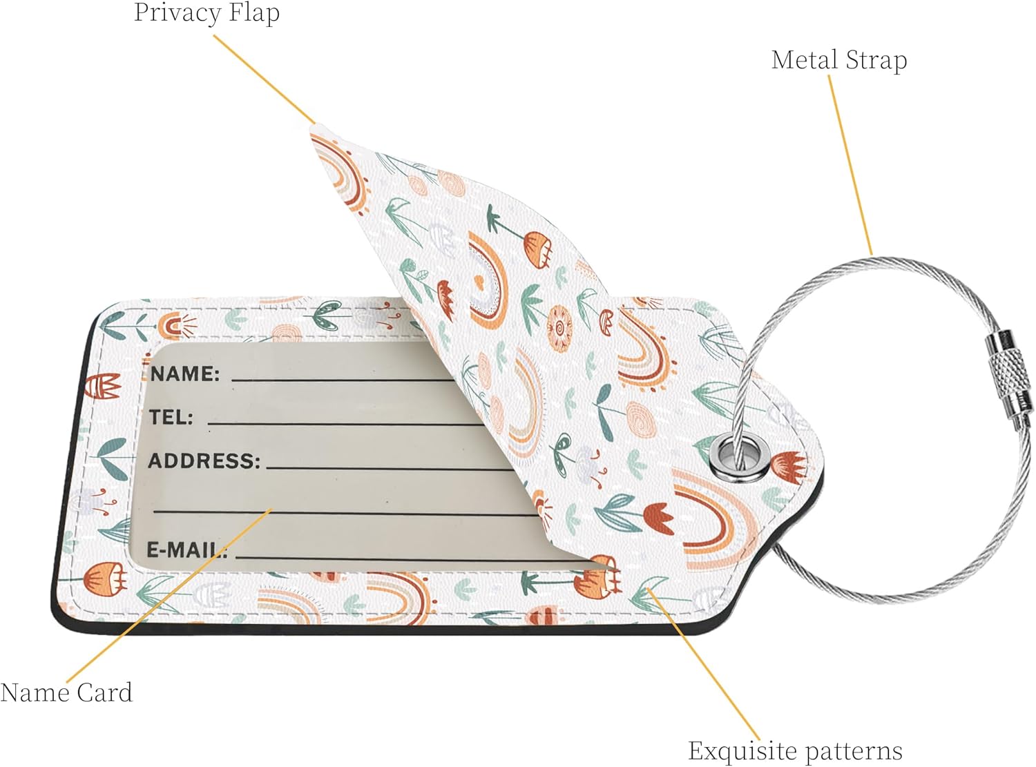 2 Pcs Luggage Tags for Suitcase, Cute Unique PU Leather Travel Bag Tag with Privacy Cover ID Label Address Card and Durable Metal Ring Suitable for Men Women Children Backpack,Rainbow and Flowers
