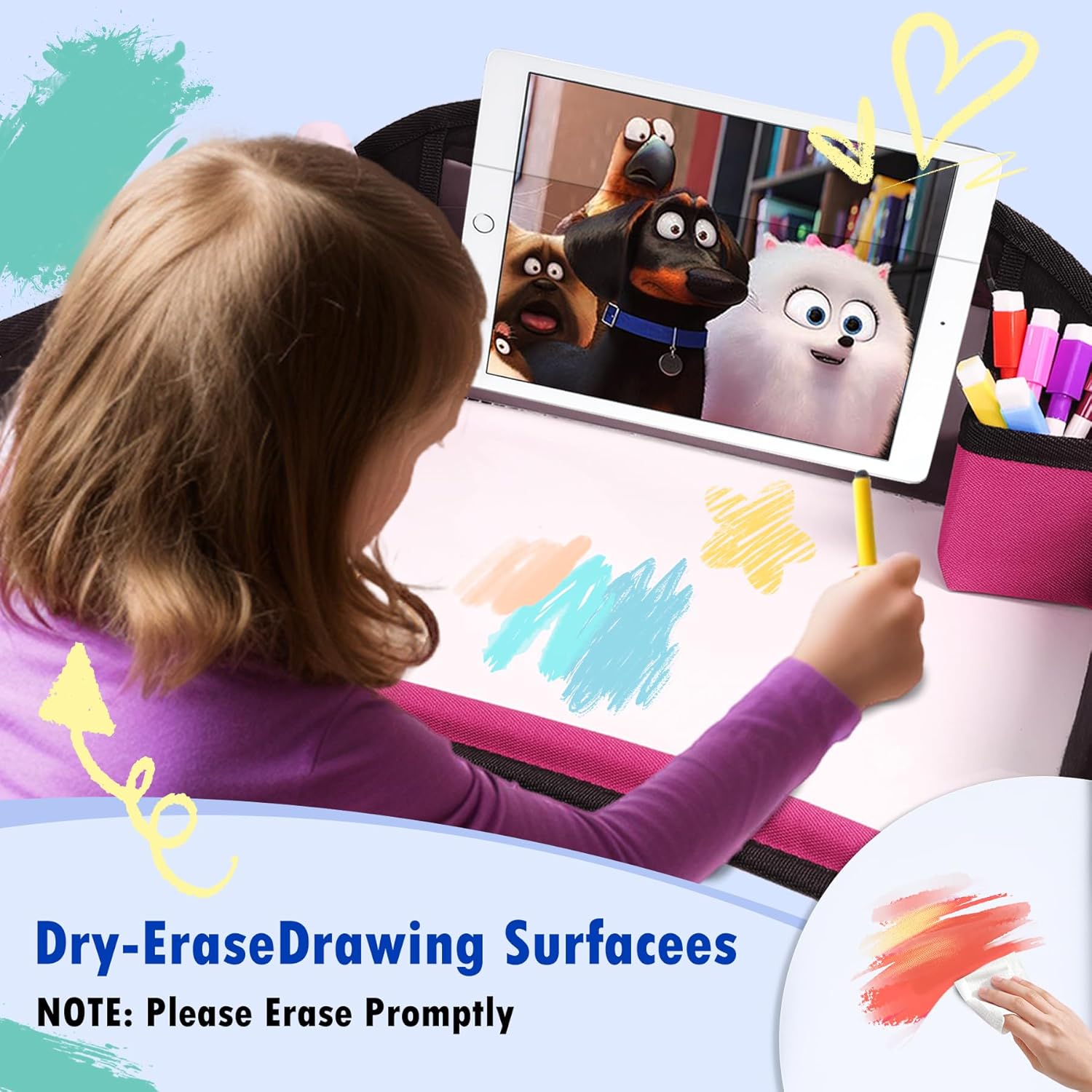 - Multi-Function Travel Tray For Kids Car Seat: Our car tray for kids features convenient organizational pockets to hold your kids small cards, and a built-in portable tissue holder for easy access. The car seat tray also includes a cup holder, keeping drinks within reach, while the raised edges prevent snacks, pens, or toys from falling off. More than just a wipe-clean drawing surface, car seat tray doubles as a snack tray—so kids can eat and play without switching spots!