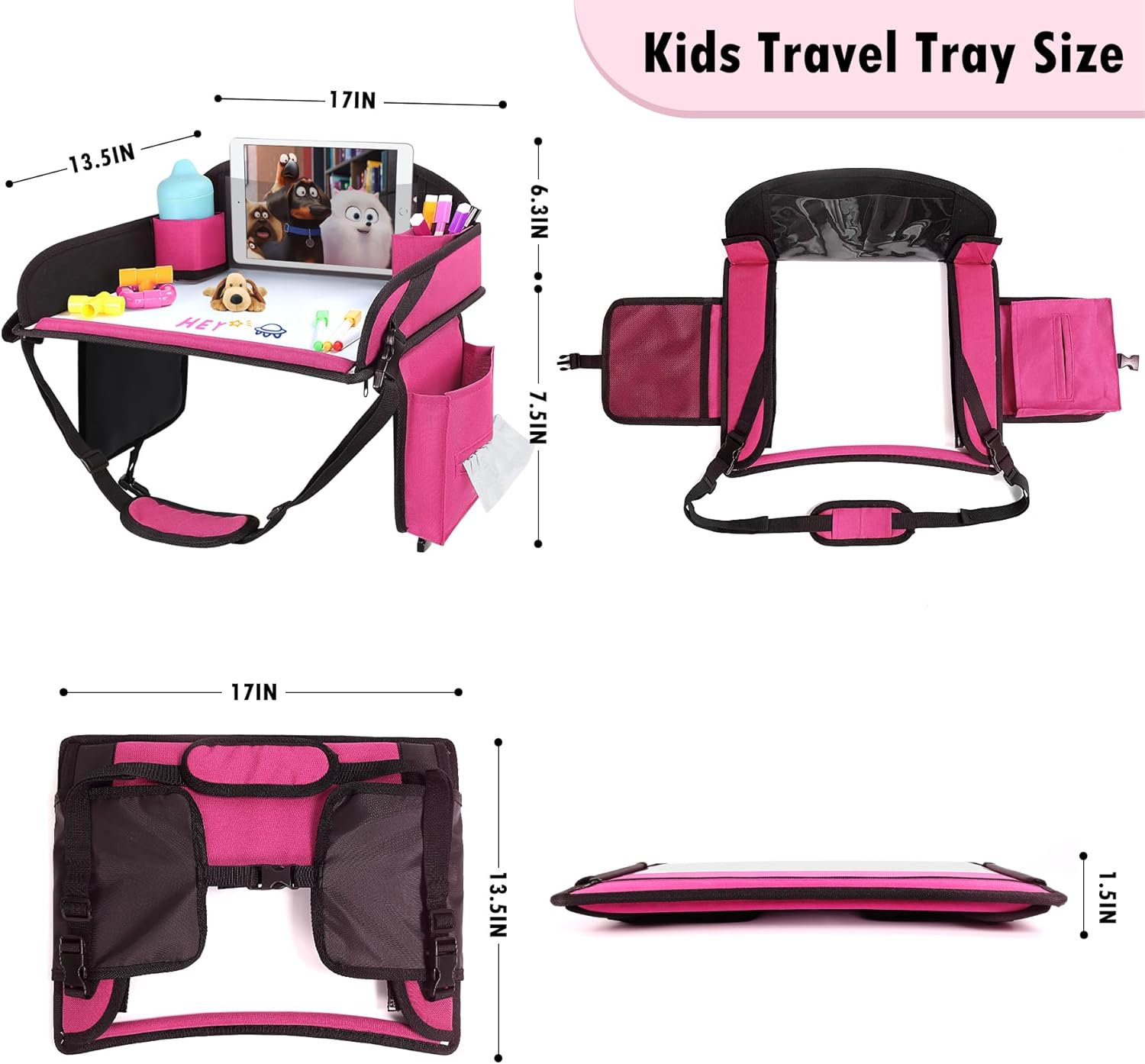 - Car Seat Table Size : Our 17" x 13.5" x 1.5" kids travel tray for car seat is compatible with most kids car seats and airplane seats. The adjustable shoulder strap and foldable design make car seat tray easy to store, while the car seat tray even doubles as a compact backpack for added portability. Perfect for use cars, airplanes, trains, camping, parks and more. The toddler travel tray for car seat can be the birthday gifts and Christmas gifts for your kids