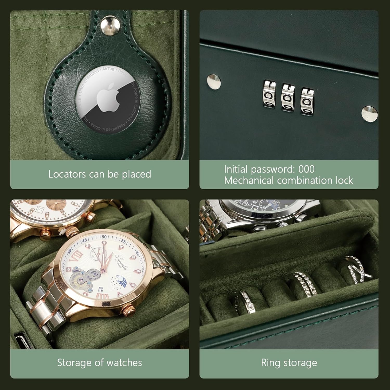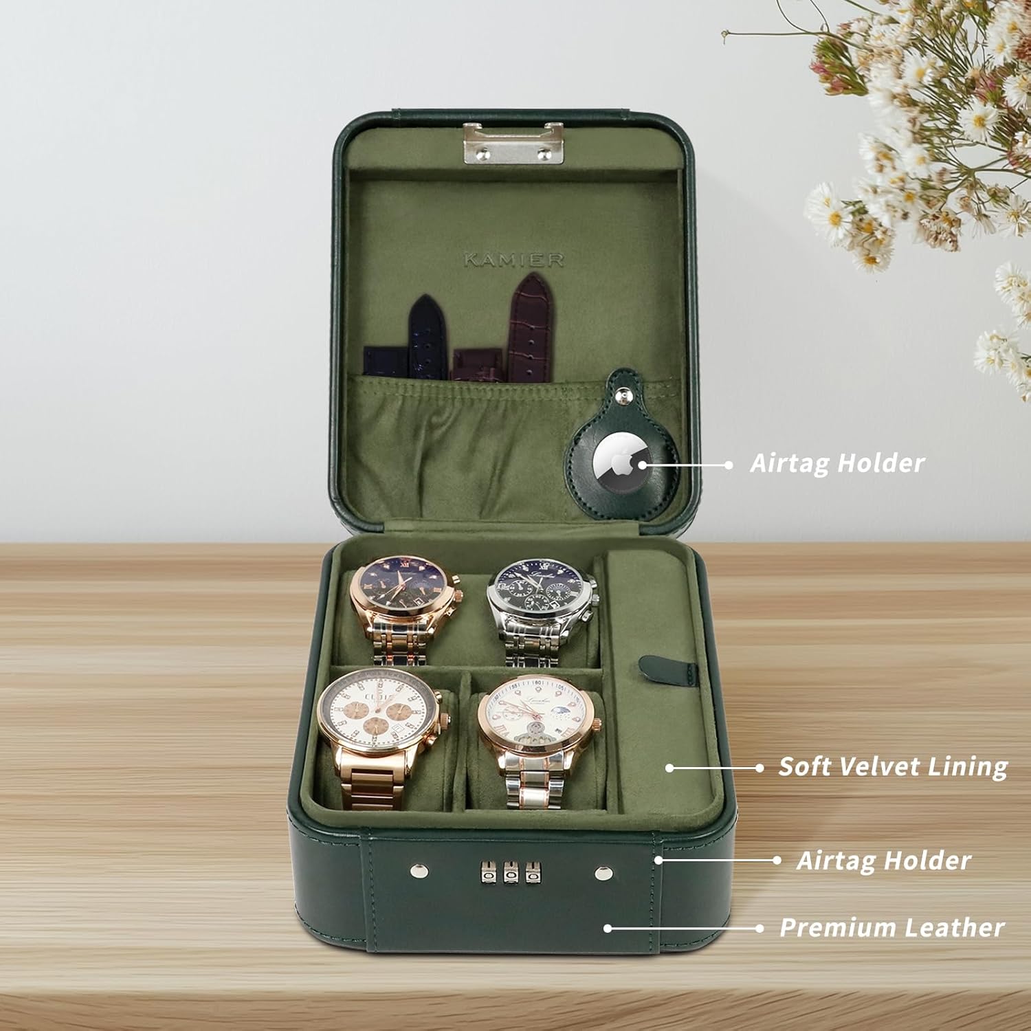 KAMIER Watch Case with Combination Lock - 4 Watch Storage and Jewelry Organizer - Watch Travel Case for Ring and Watch Storage, PU Leather Travel Watch Case, Ideal for Gift (With Gift Box), Green