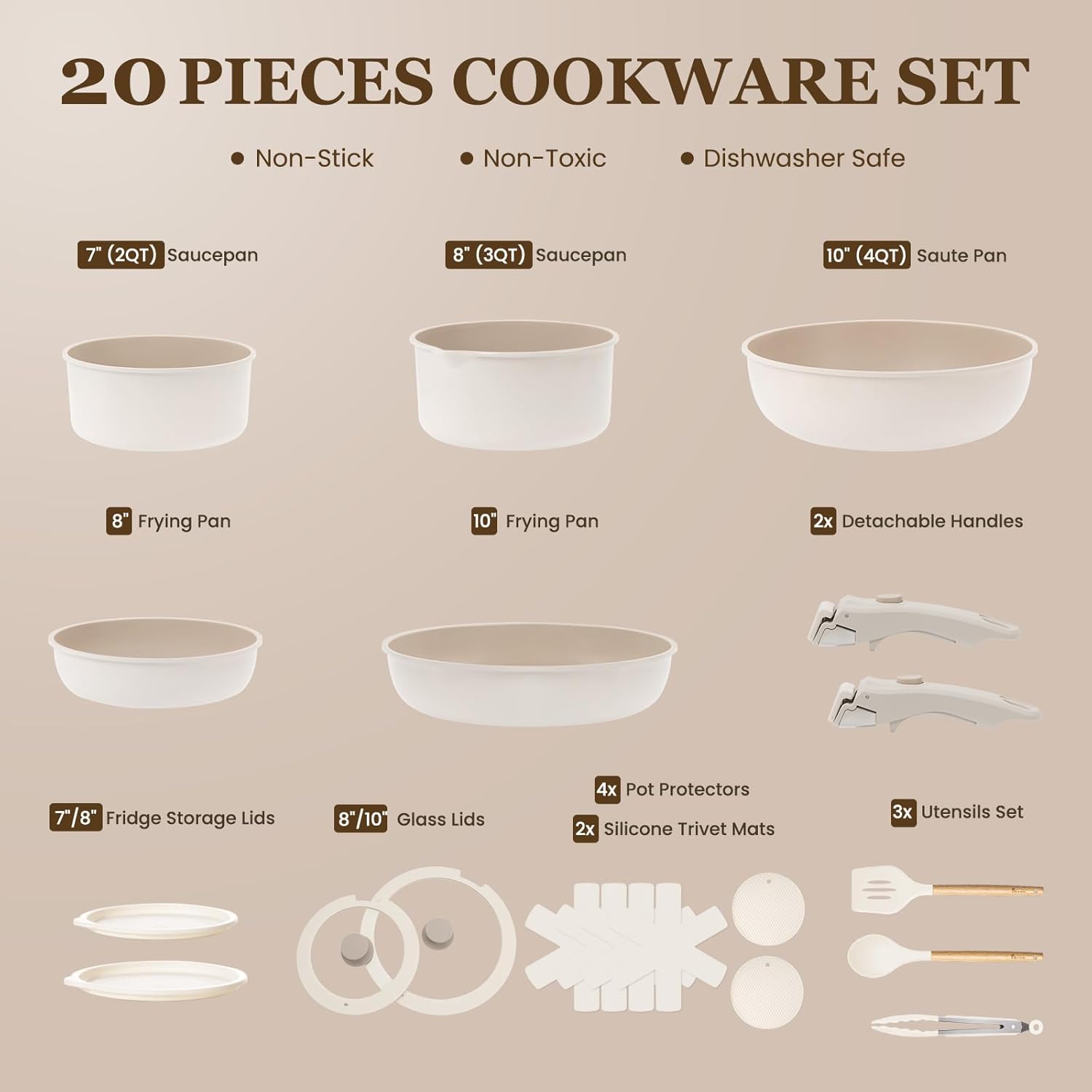 - γππππ ππΌπΎπ πππ πΎππππππγKIKCOIN cookware set includes 7" (2 quart) saucepan, 8" (3 quart) saucepan, 8" frying pan, 10" large frying pan, 10" (4 quart) Saute pan, 8" &10" silicone rimmed glass lid, 7"/8" Fridge Lid, 3x silicone Utensils (Slotted Turner&Soup Ladle&Tongs), 4x pot protectors and πͺπ£ππ¦πͺπ π¬ππ©π 2 silicone trivet mat for hot pots and pans.