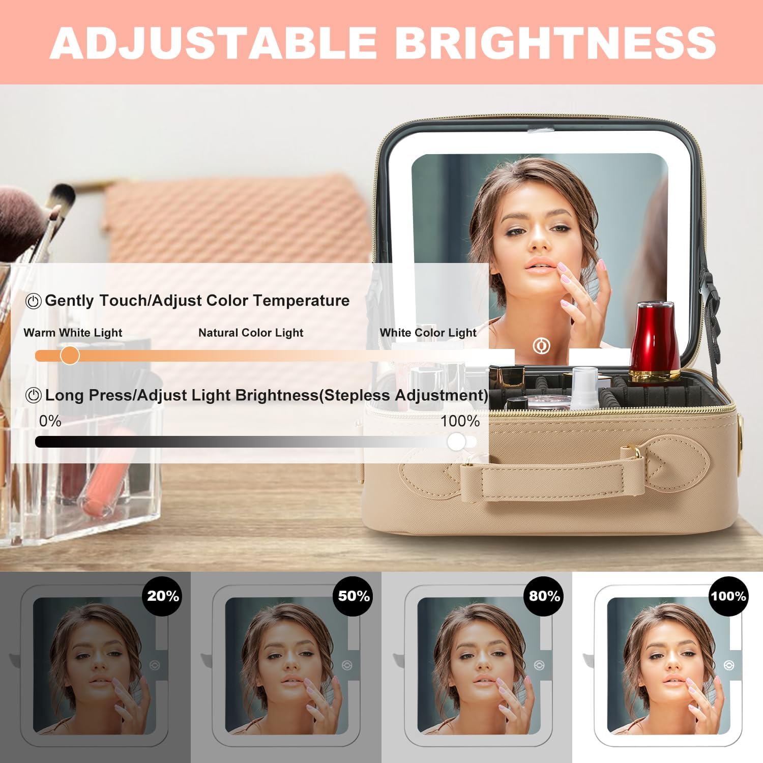 Mocado Travel Makeup Bag with LED Lighted Mirror,Travel Makeup Organizer,Makeup Case with 3 Color Lighted Setting and 10x Magnifying Mirror,Portable Storage and Adjustable Dividers Makeup Box(Khaki)
