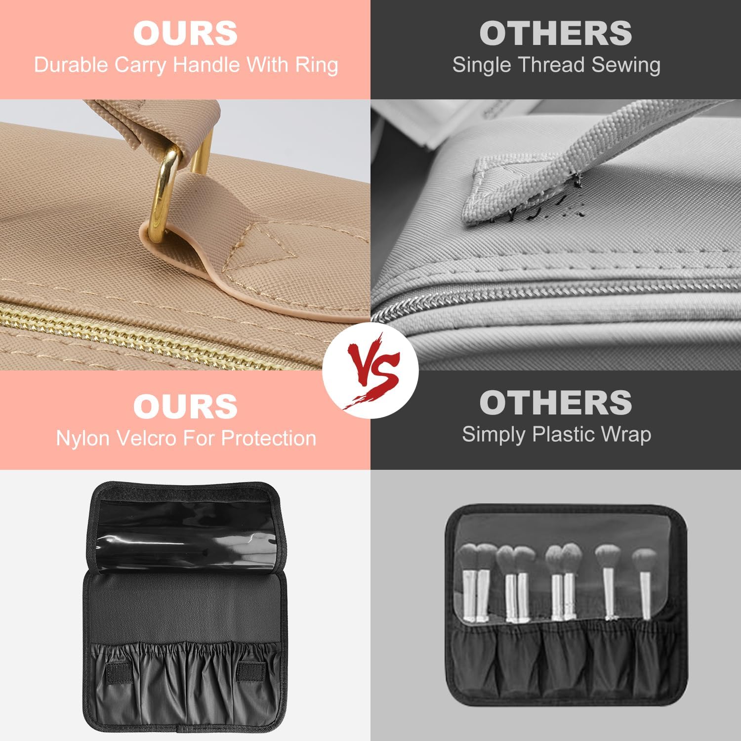 - 👍【Flexible and Large Storage Space】:Reasonable design makes the makeup bag easy to carry, not only can you store cosmetics and makeup tools, but also jewelry, electronic accessories, camera accessories, toiletries, etc. Removable EVA sponge divider Can DIY the space you need to meet your needs. Can accommodate a variety of sizes of cosmetics and makeup brushes. Which can well protect the cosmetics inside, ensure no breakage or leakage, and also keep them clean and dry.