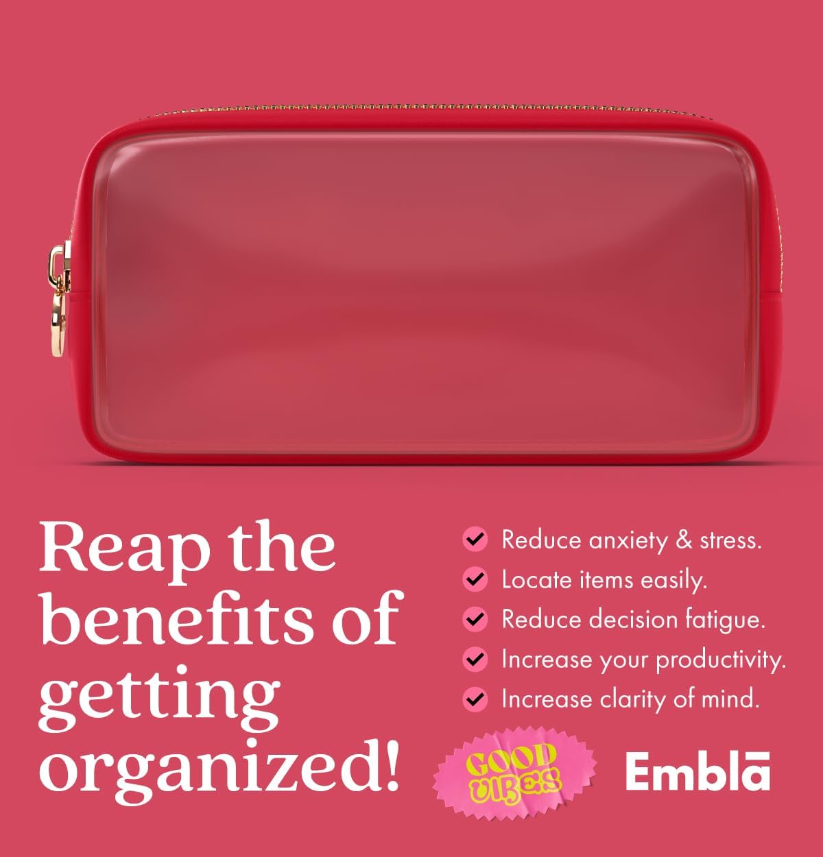 - EMBLA, TRUSTED BY THOUSANDS - Join our huge community who all rave about the superior quality of our products. Looking for a large makeup bag for organization, a small makeup bag for purse or super cute travel pouches? you're in the right place! These bags also make for a great gift for birthdays, bridesmaids, Valentines Day, Mother’s day, Christmas, teacher appreciation and other special occasions.