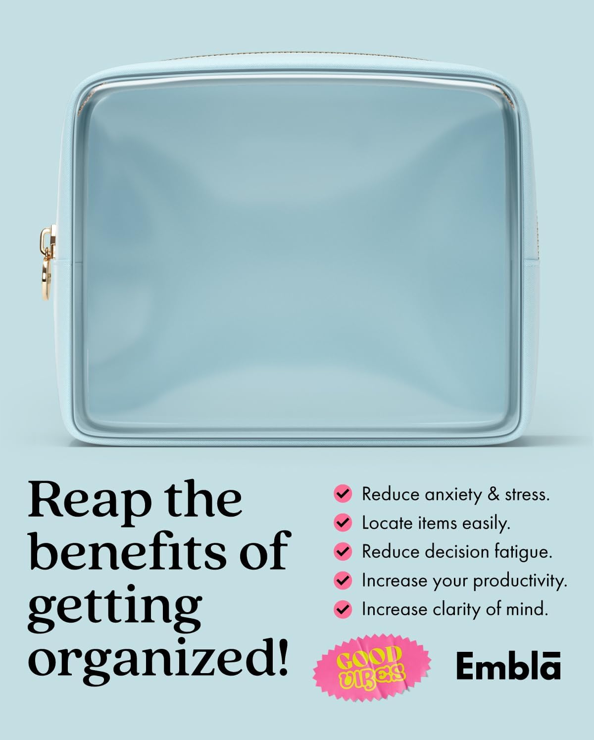 - TRAVEL IN STYLE - Need a clear makeup bag small or large for traveling to carry on to your airline flight? Our transparent TSA approved toiletry bag pouches will make your traveling stress free. This versatile bag can be used as a clear toiletry bag, makeup pouch, makeup case, or storage bag, making it the perfect companion for any occasion! The PVC vinyl clear makeup bag travel bag by Embla should be included in any travel essentials for women.