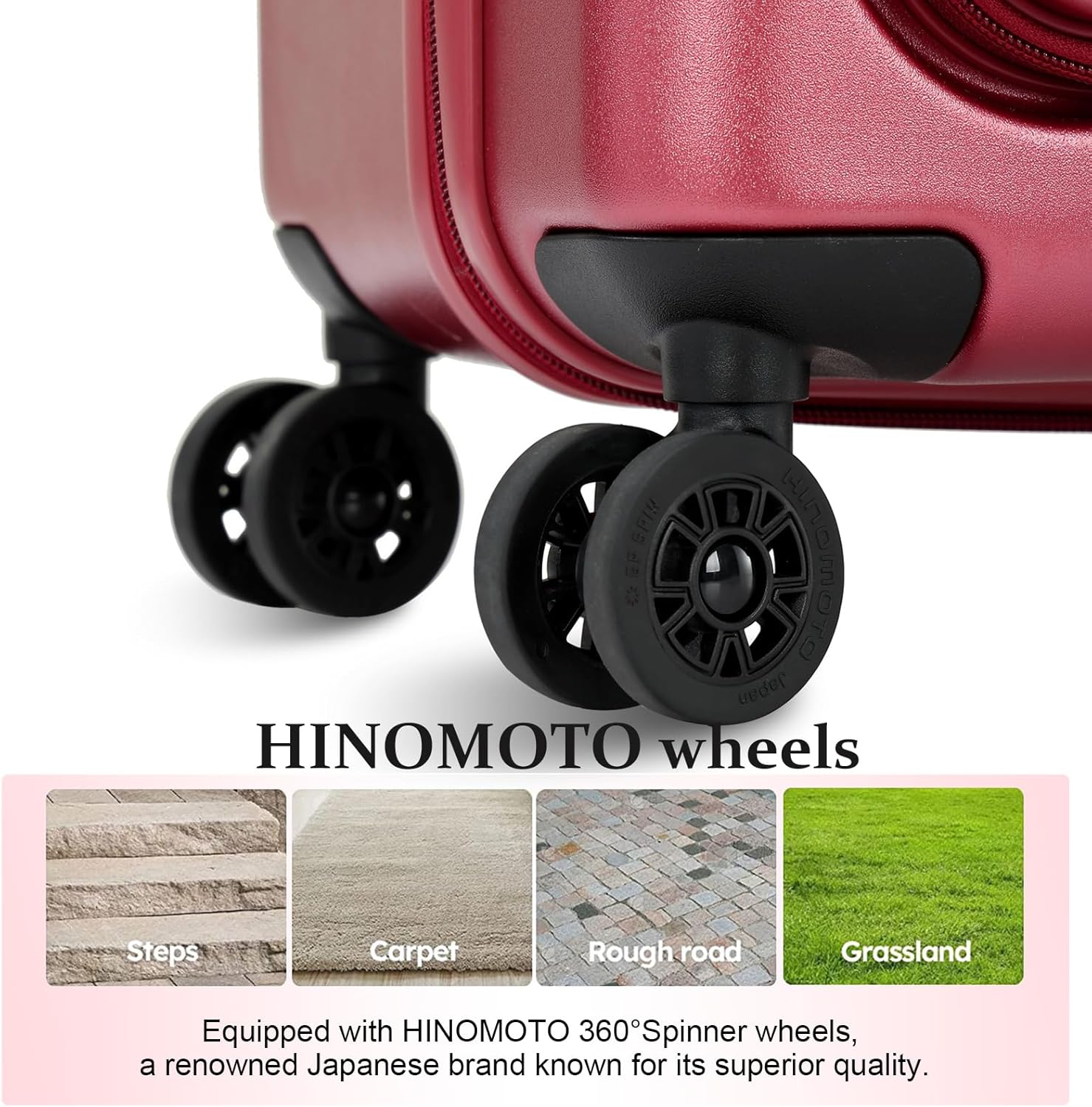 - Silent Glide, Effortless Travel: Equipped with HINOMOTO wheels, a renowned Japanese brand known for its superior quality, our luggage ensures a quiet and smooth rolling experience. These wear-resistant wheels are designed to glide effortlessly, allowing you to navigate through airports or crowded places with ease.