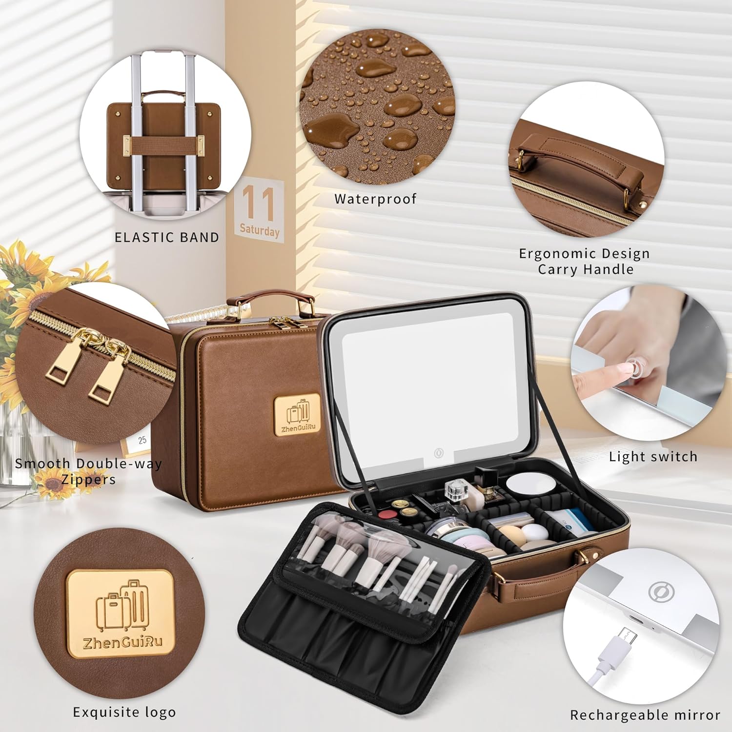 Makeup Bag with LED Mirror & Magnifier, Large Cosmetic Organizer Travel Makeup Case with Adjustable Brightness & 6 Detachable Dividers, Portable Makeup Storage for Women Girls (Brown)
