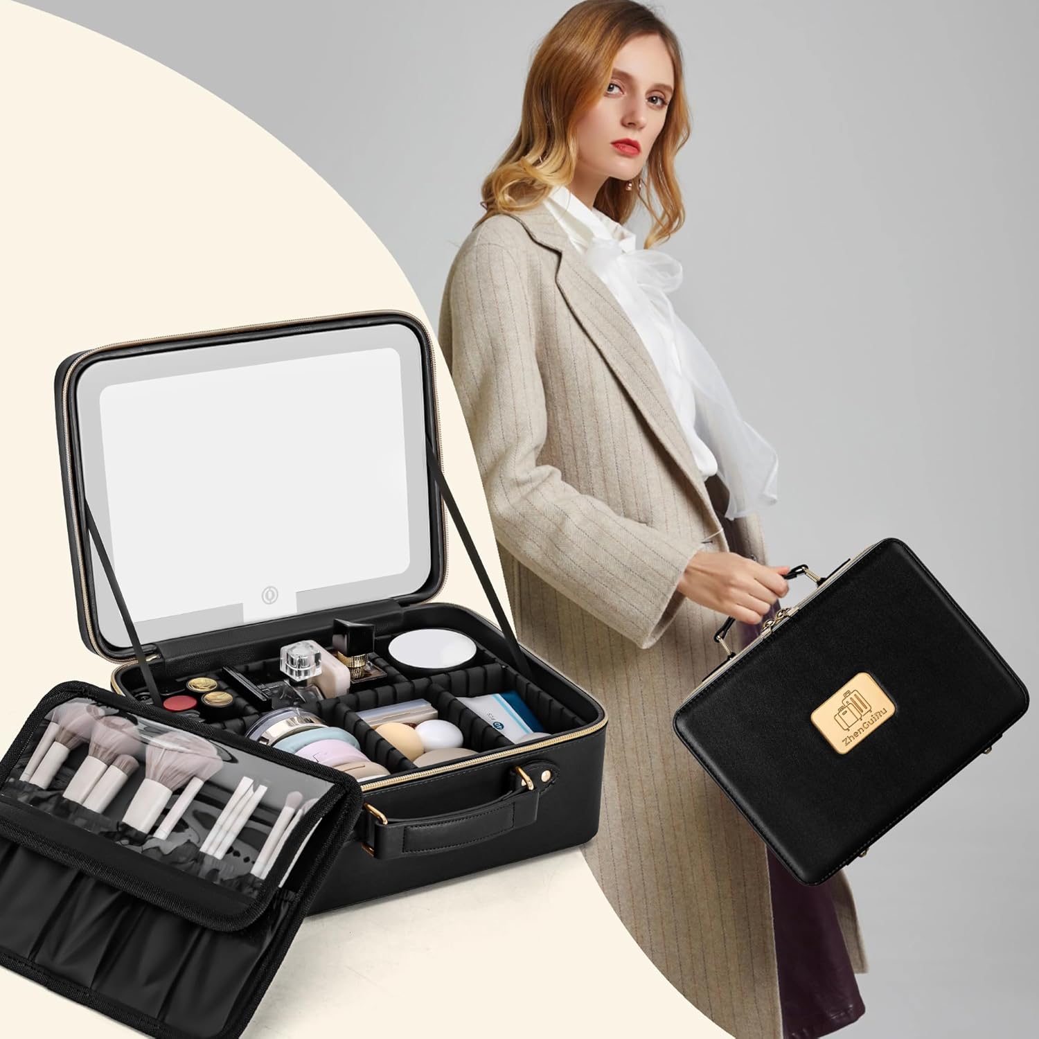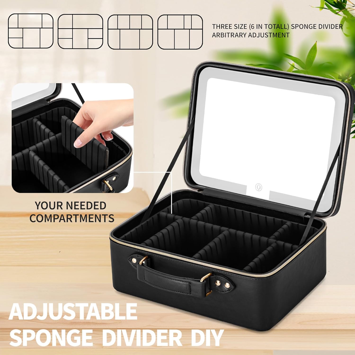 Makeup Bag with LED Mirror & Magnifier, Large Cosmetic Organizer Travel Makeup Case with Adjustable Brightness & 6 Detachable Dividers, Portable Makeup Storage for Women Girls (Black)