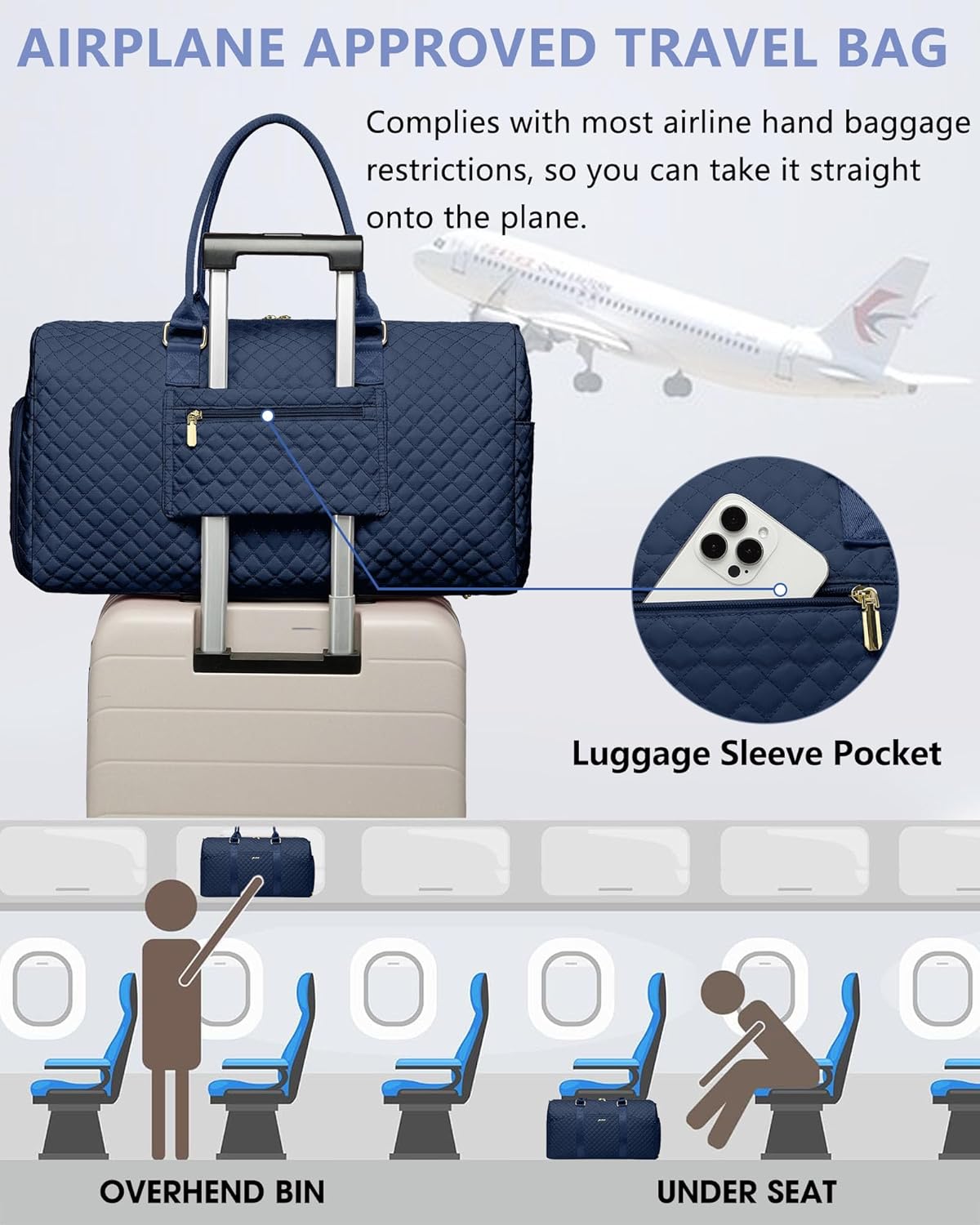 - AIRPLANE APPROVED TRAVEL BAG WITH SHOE COMPARTMENT - In the right side of the overnight bags, a separate shoe compartment can help you carry your shoes better. Carry on bag have 2 ventilation holes that disperses bad odors. Luggage strap on the back of the weekender travel bag can be inserted and secured to the handle of the luggage, freeing your hands on a trip. One zippered pocket on the back to hold your phone, passport. Duffle bag fits perfectly in the overhead bin and under the seat.