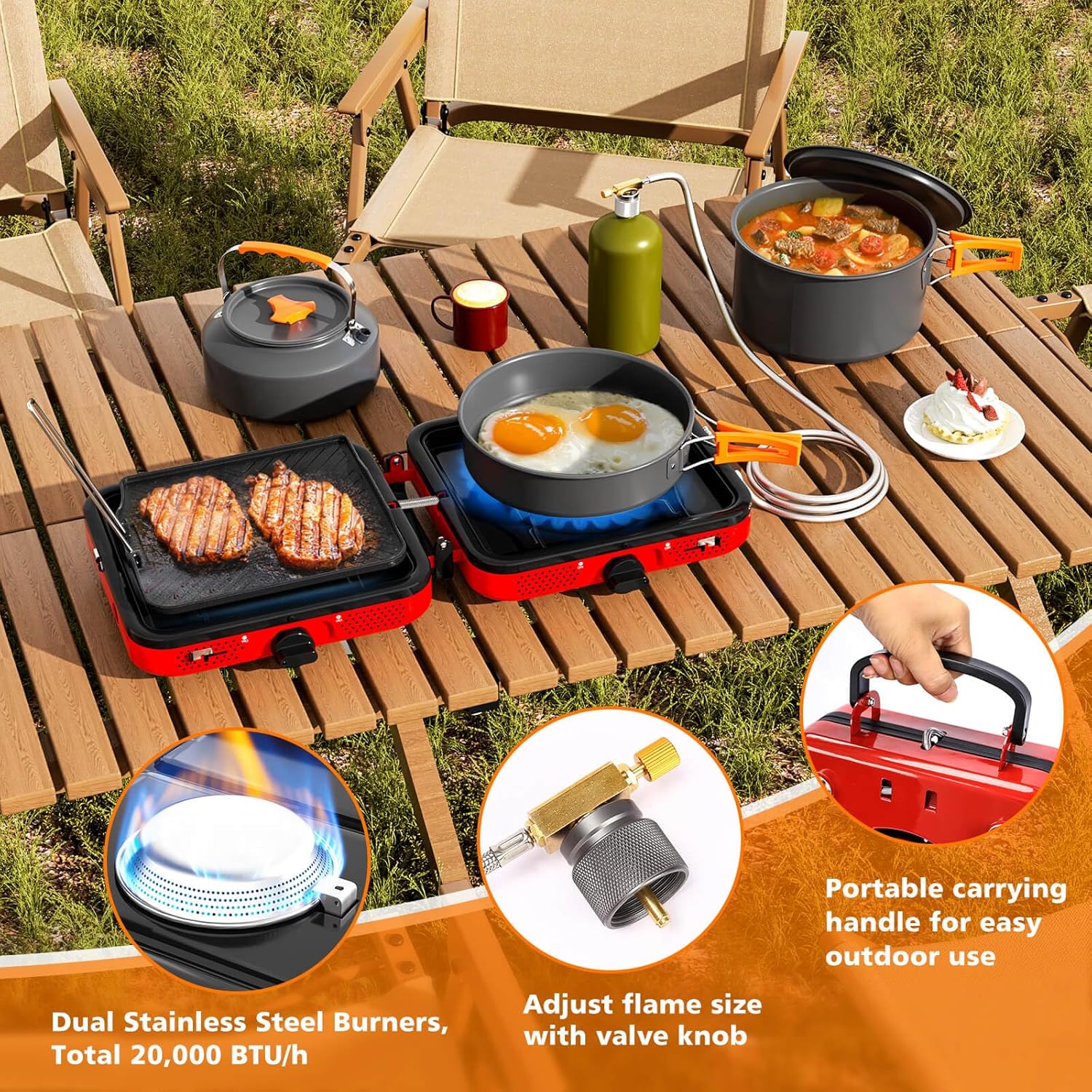 - [Lightweight & Compact Design for Easy Transport] – Weighing only 8.9 lbs, this portable stove set is easy to carry and store, making it perfect for camping, tailgating, picnics, and other outdoor activities. It’s compact enough to fit in your car without taking up too much space.