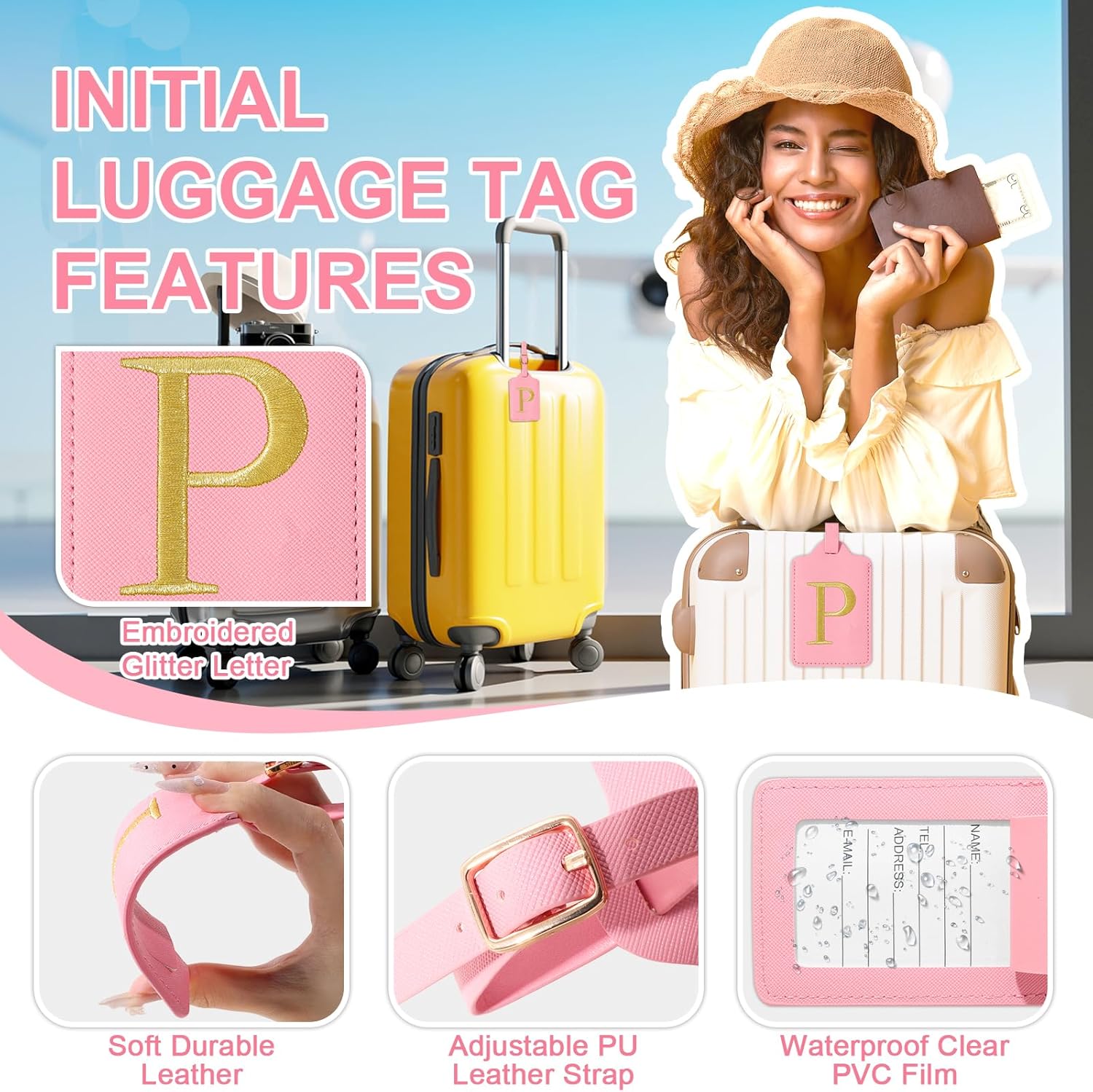- ✈【Embroidered Initials Luggage Tag】Cute exquisite A-Z personalized luggage tag for suitcases with gold border glitter embroidered letter patch, the letters are made from carefully stitched gold-colored thread.Firmly sewn to the tag, you don't have to worry about them falling off. Bright gold letters and vibrant luggage tag colors to help your suitcases be more easily recognizable at baggage claim.Monogram travel tags make your luggage more personal.