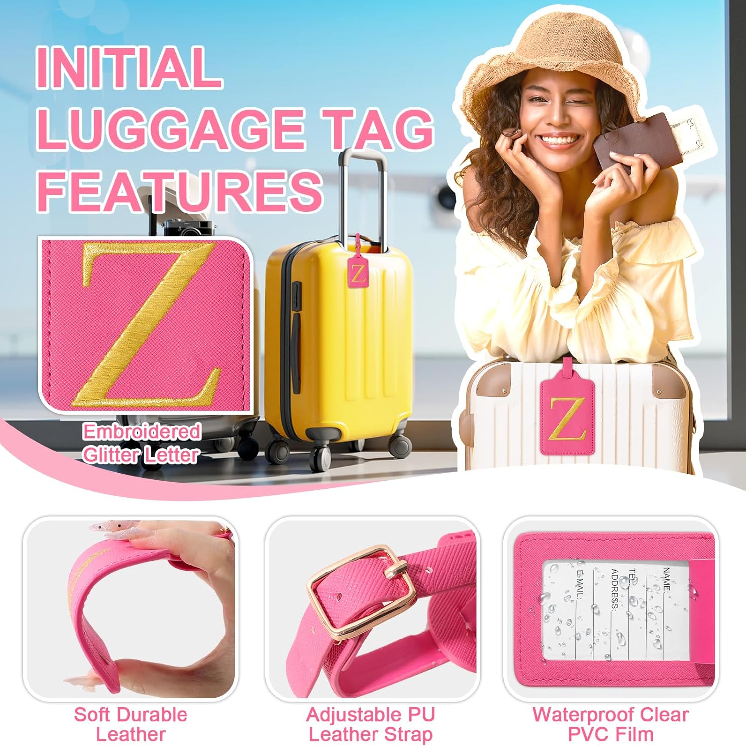 - ✈【Embroidered Initials Luggage Tag】Cute exquisite A-Z personalized luggage tag for suitcases with gold border glitter embroidered letter patch, the letters are made from carefully stitched gold-colored thread.Firmly sewn to the tag, you don't have to worry about them falling off. Bright gold letters and vibrant luggage tag colors to help your suitcases be more easily recognizable at baggage claim.Monogram travel tags make your luggage more personal.