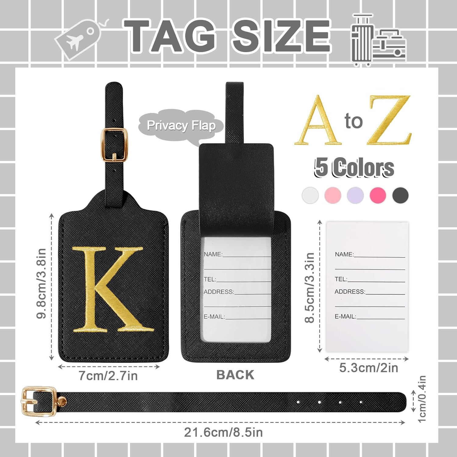 - ✈【Premium Materials】Durable costom luggage tags are made of high quality PU leather, soft and slim, not easy to deform, suitable for long-term reuse! The front of the baggage tag is stitched with bright gold initials A-Z and the sides are sewn with silk thread, able to withstand the wear and tear of extended use and travel. And there is a thick piece of clear PVC under it, so luggage tag has a certain waterproof effect in rains (not underwater).