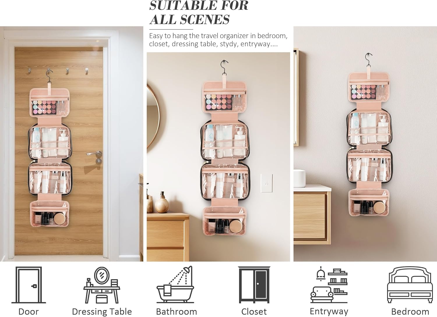 • STURDY HOOK FOR EASY ACCESS: Equipped with a 360°swivel metal hook, you can easily hang this toiletry bags for traveling anywhere, providing versatile hanging options and allowing access all your stuff without needing to unpack or take everything out. With the hanging toiletry bag, all you need to do is hanging it up without cluttering up the bathroom vanity or night table. You can fold the compartments and close it into a compact travel bag. Perfect for business trips, travel, cruise ship etc